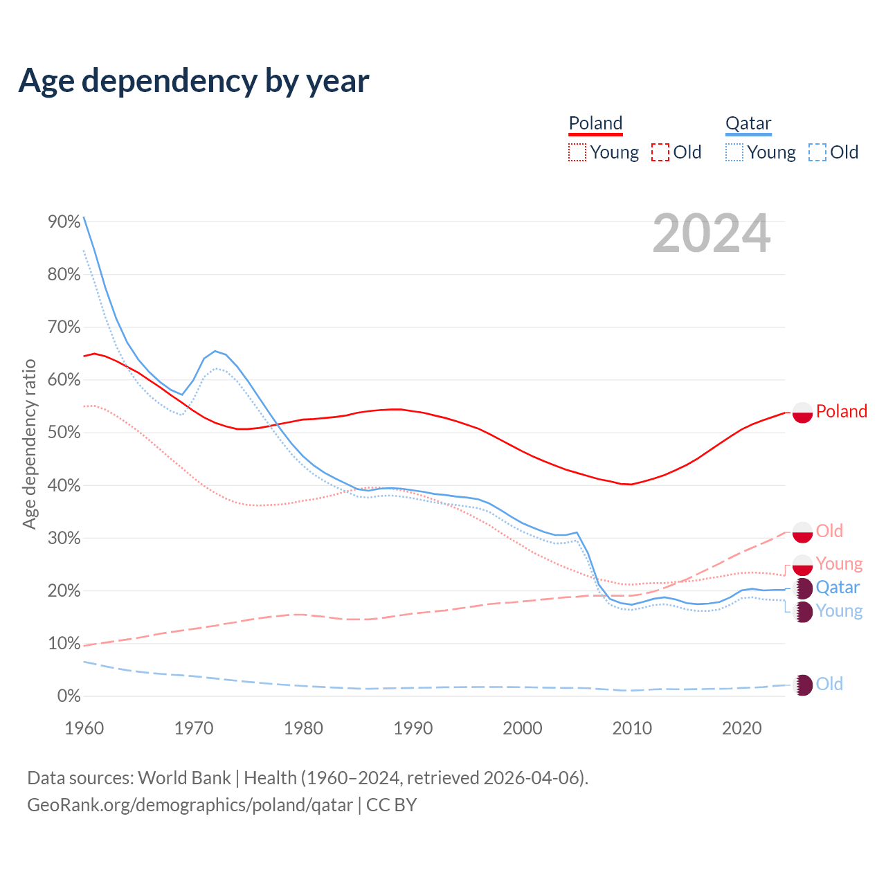 - Poland is ranked 30/196 by median age (oldest to youngest) vs 78/196 for Qatar.