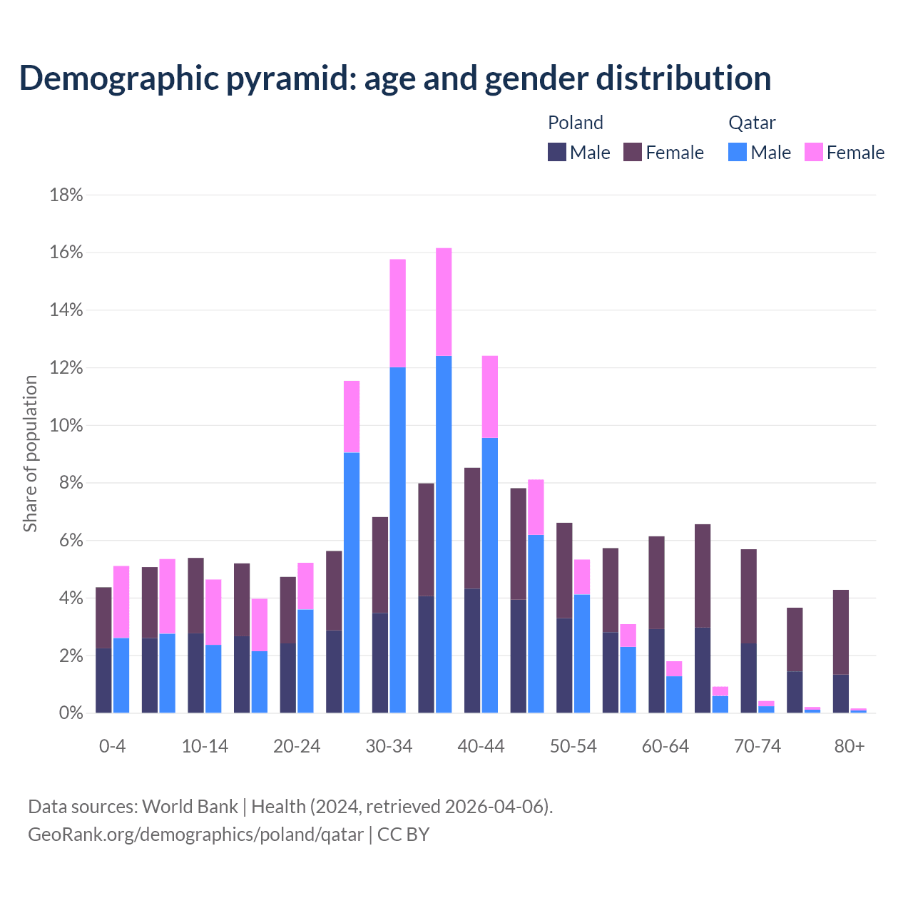 - As of 2026, the population of Poland is 35.8M vs 3M in Qatar - 11.9 times difference.