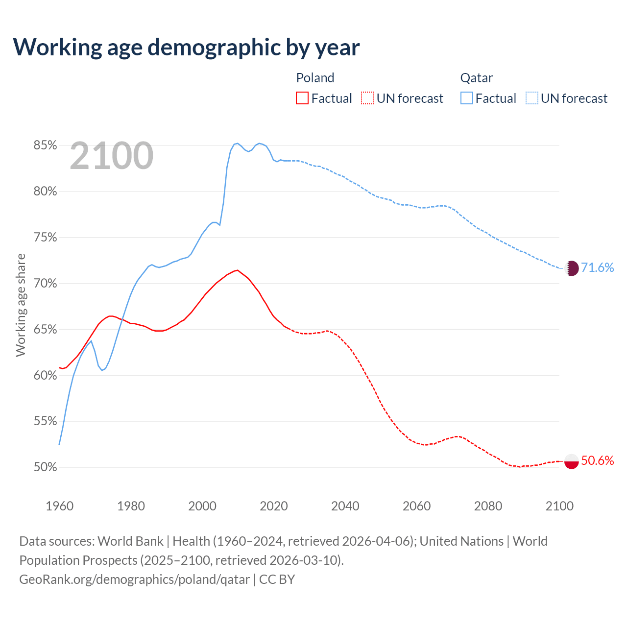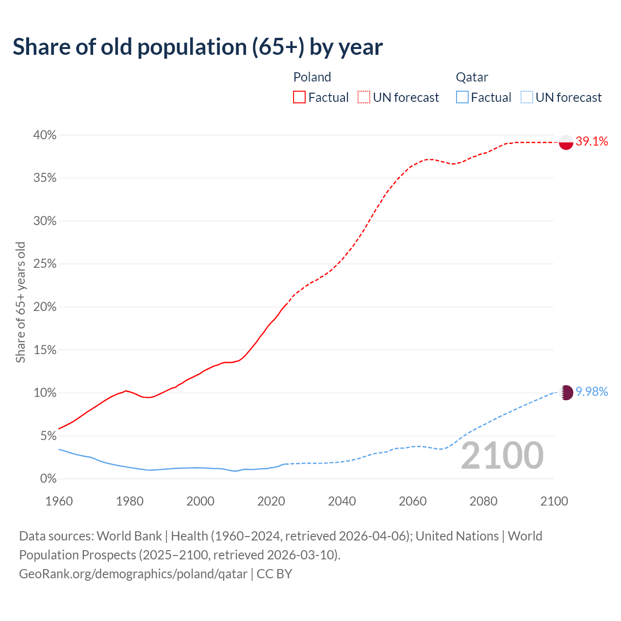 Median age Poland vs Qatar, 1960-2100