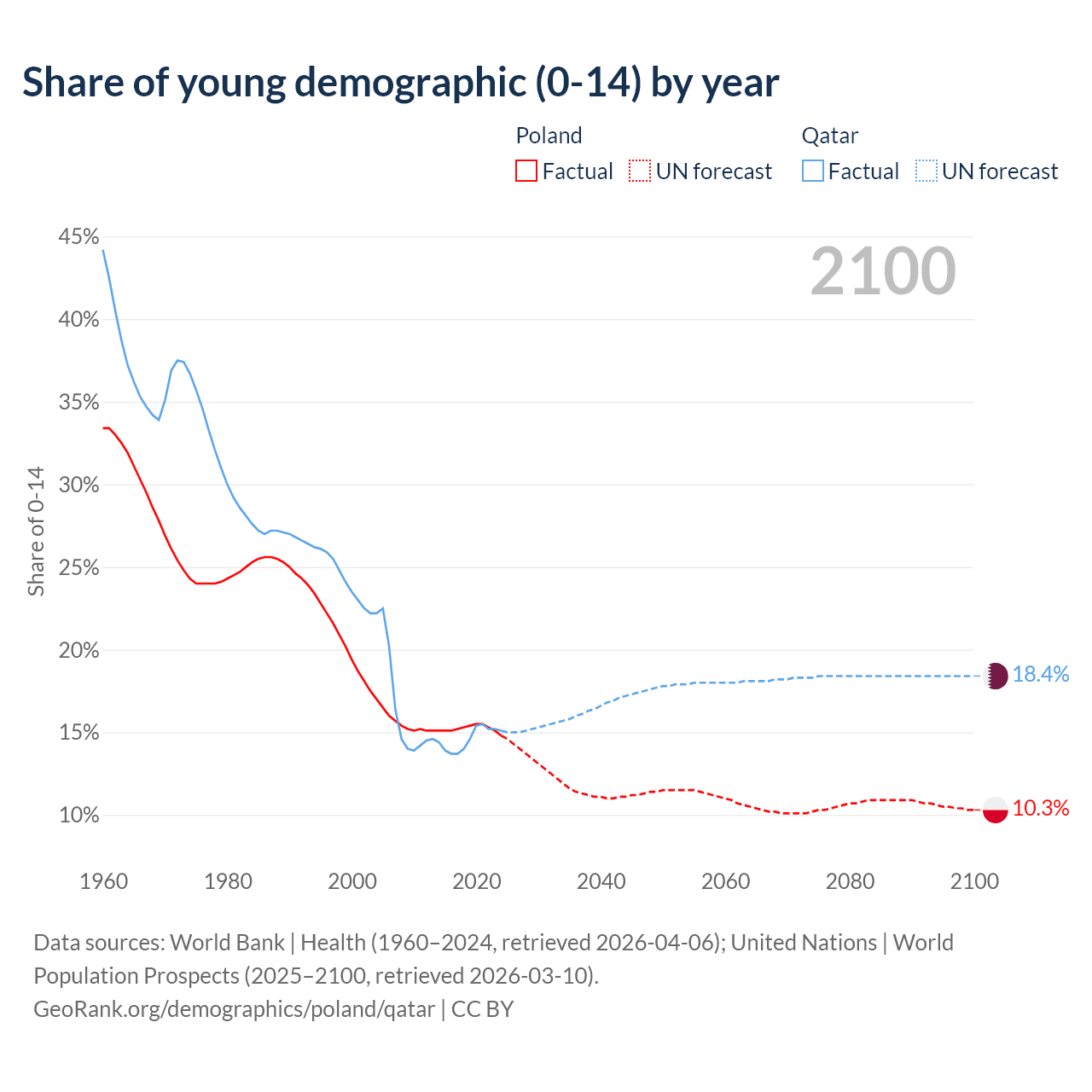 - The share of young demographic (0-15 years old) in Poland is 14.8% vs 15.1% in Qatar.
