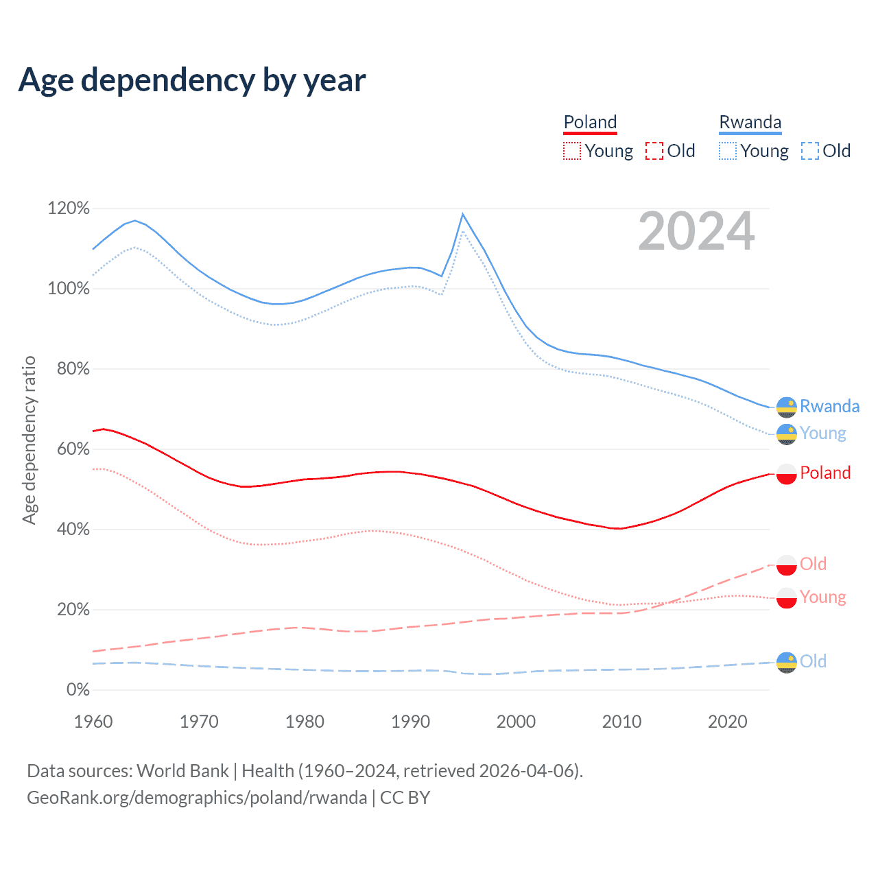 - The share of old-age demographic (65+) in Poland is 20.1% vs 3.93% in Rwanda.