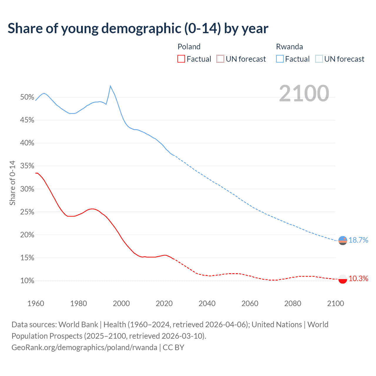 - The share of young demographic (0-15 years old) in Poland is 14.8% vs 37.4% in Rwanda.