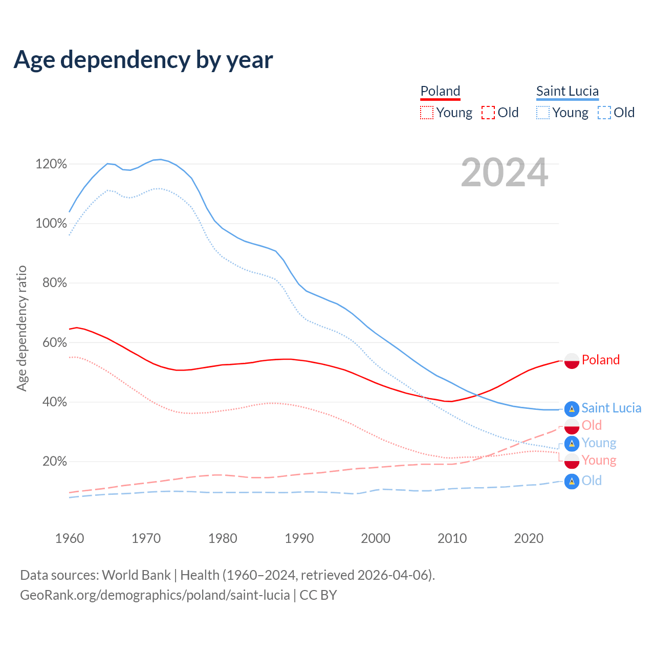- Poland is ranked 30/196 by median age (oldest to youngest) vs 74/196 for Saint Lucia.