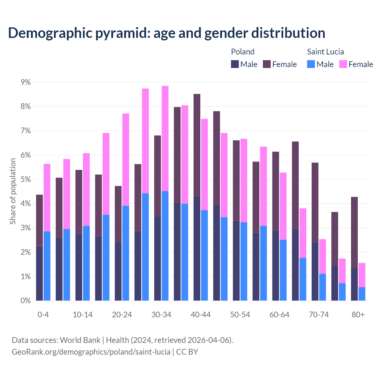 - The share of old-age demographic (65+) in Poland is 20.1% vs 9.62% in Saint Lucia.