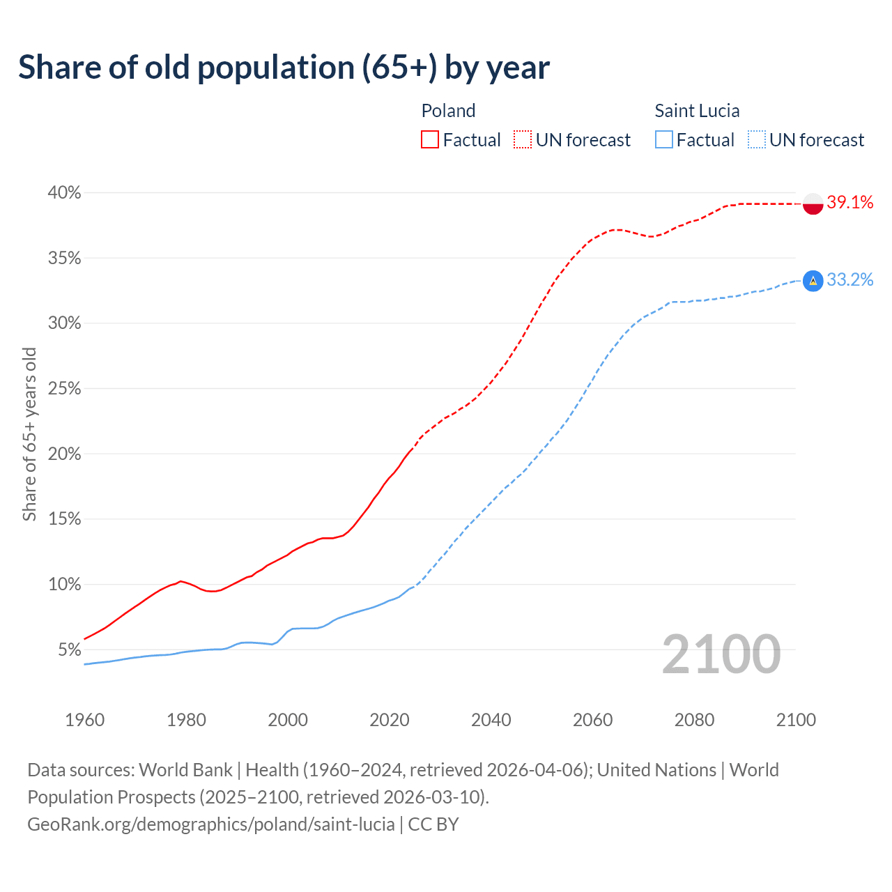 The share of older people aged 65 and over is 20.1% in Poland and 9.62% in Saint Lucia. Life expectancy in Poland compared to Saint Lucia .