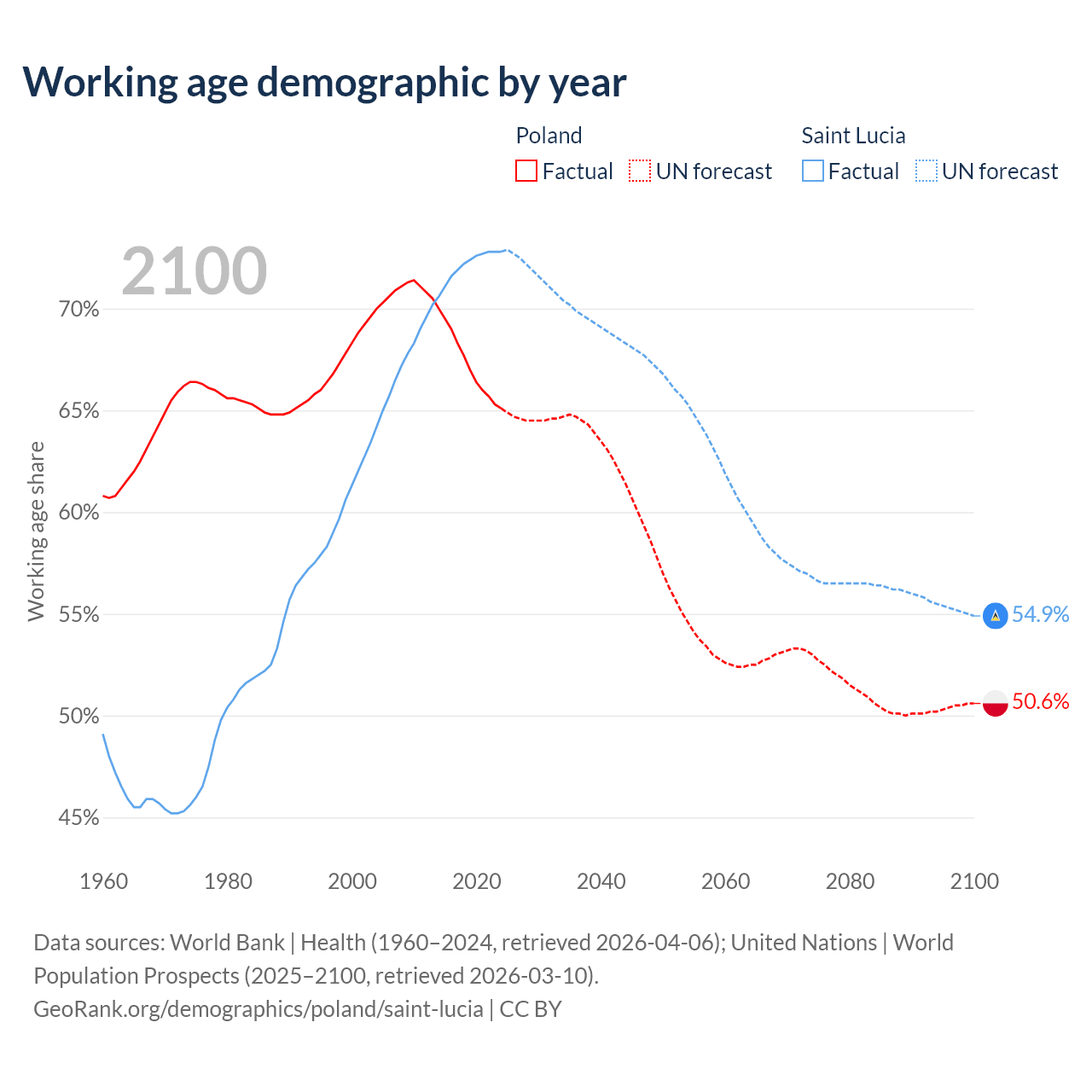 - Poland has 23.3M working age adults (aged 15-64) vs 132K in Saint Lucia.