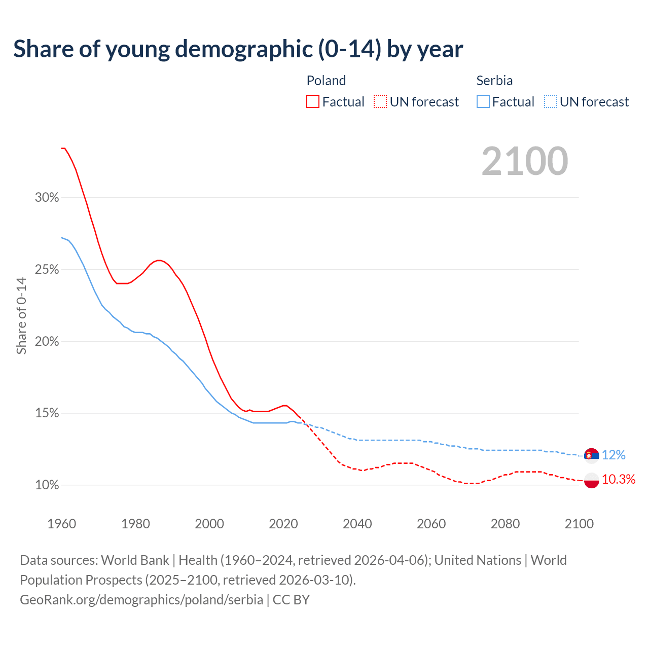 Median age Poland vs Serbia, 1960-2100