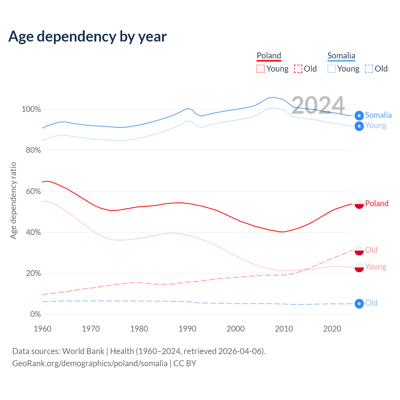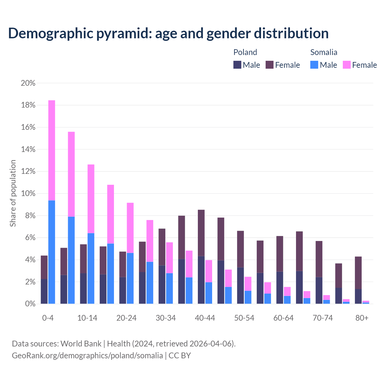 - Poland is ranked 30/196 by median age (oldest to youngest) vs 194/196 for Somalia.
