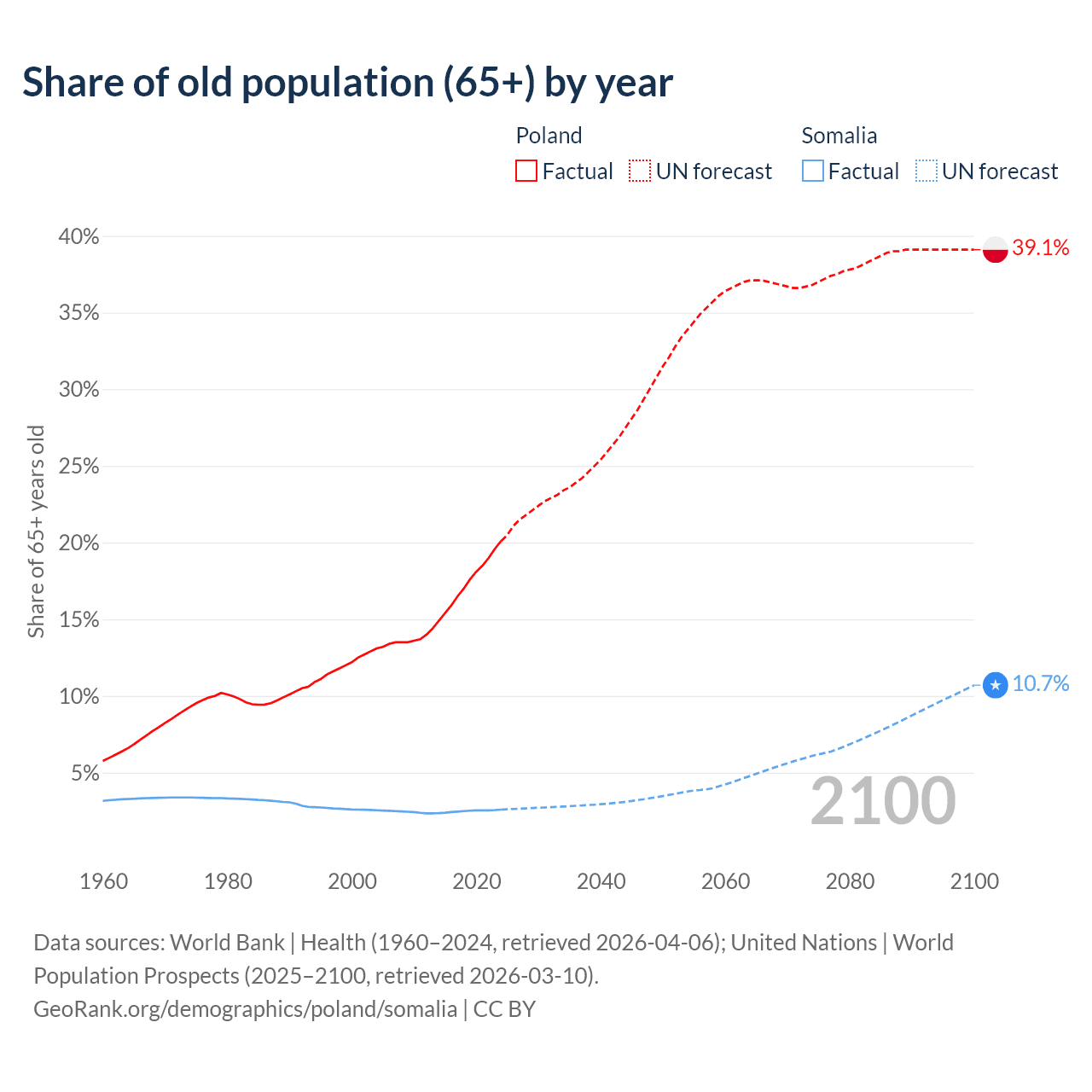 - The share of old-age demographic (65+) in Poland is 20.1% vs 2.59% in Somalia.