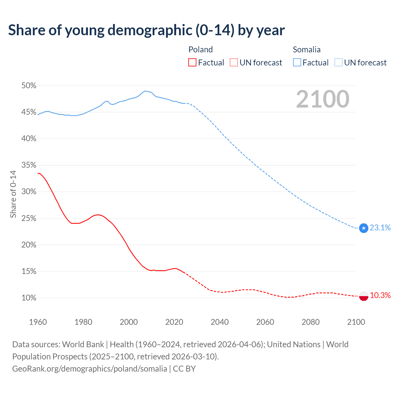 - The share of young demographic (0-15 years old) in Poland is 14.8% vs 46.6% in Somalia.