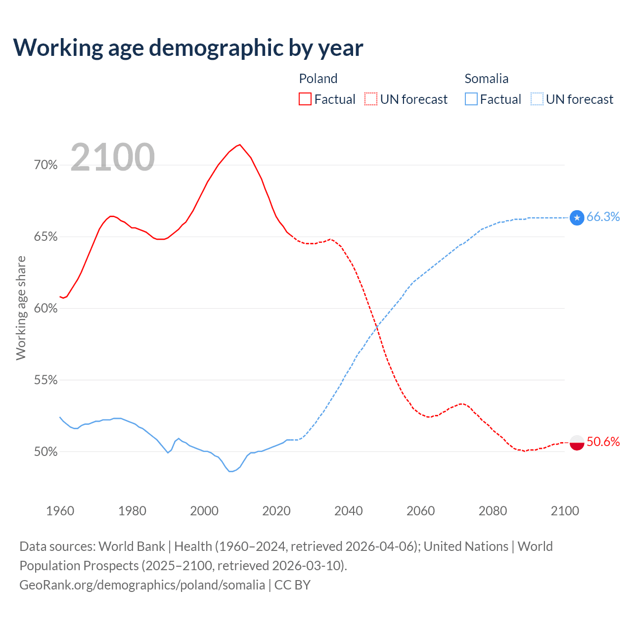 - Poland has 23.3M working age adults (aged 15-64) vs 10.4M in Somalia.