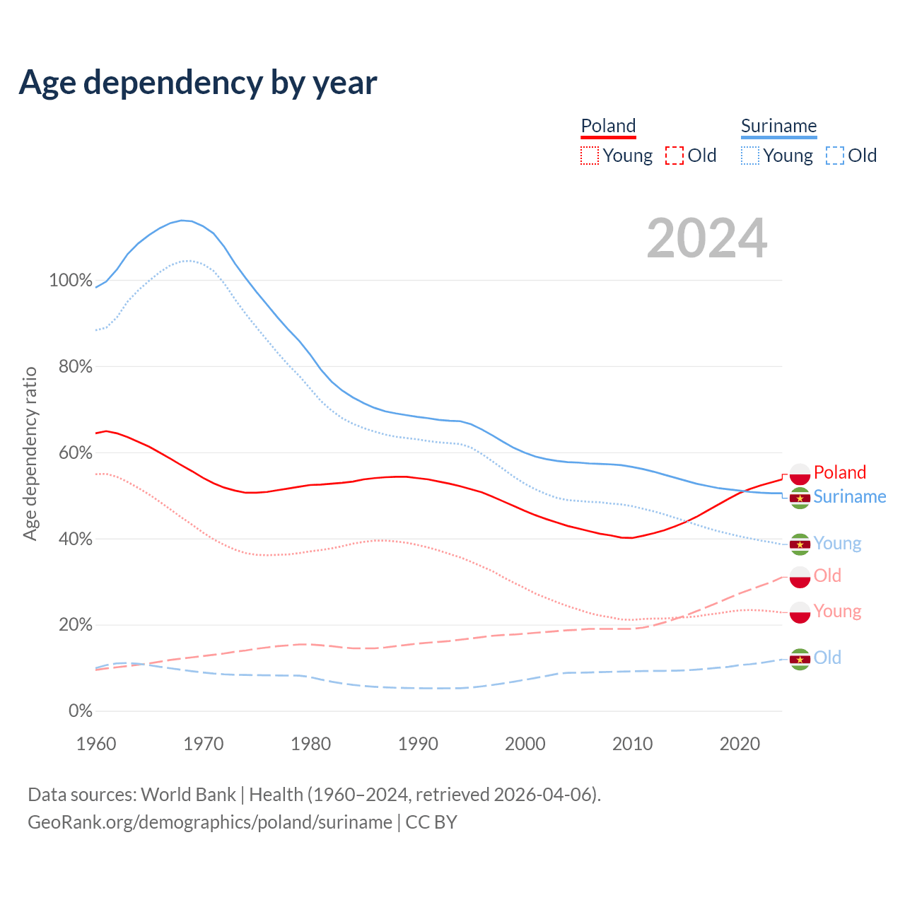 - The share of young demographic (0-15 years old) in Poland is 14.8% vs 25.6% in Suriname.