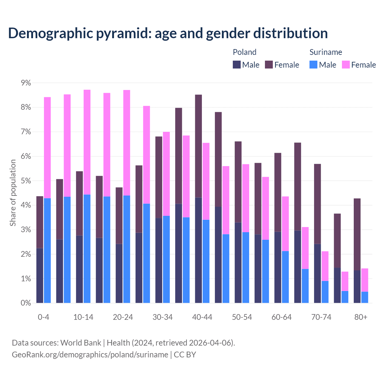 - The share of old-age demographic (65+) in Poland is 20.1% vs 7.9% in Suriname.
