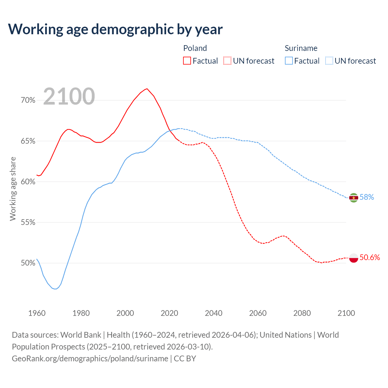 Median age Poland vs Suriname, 1960-2100