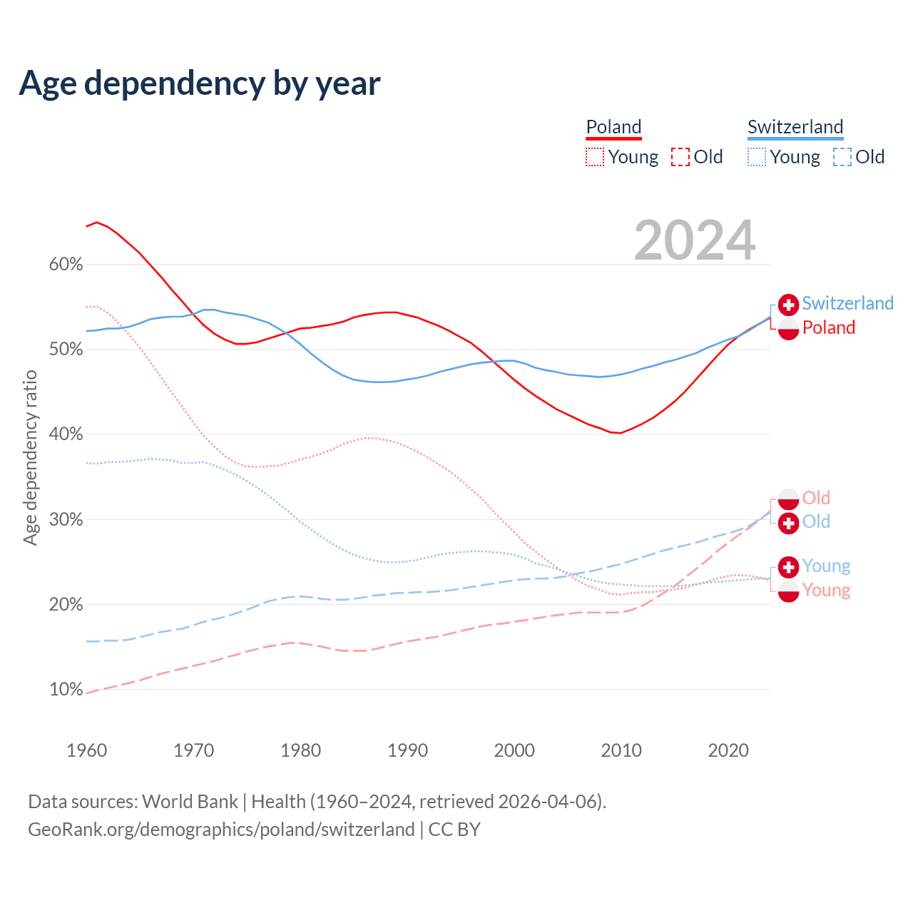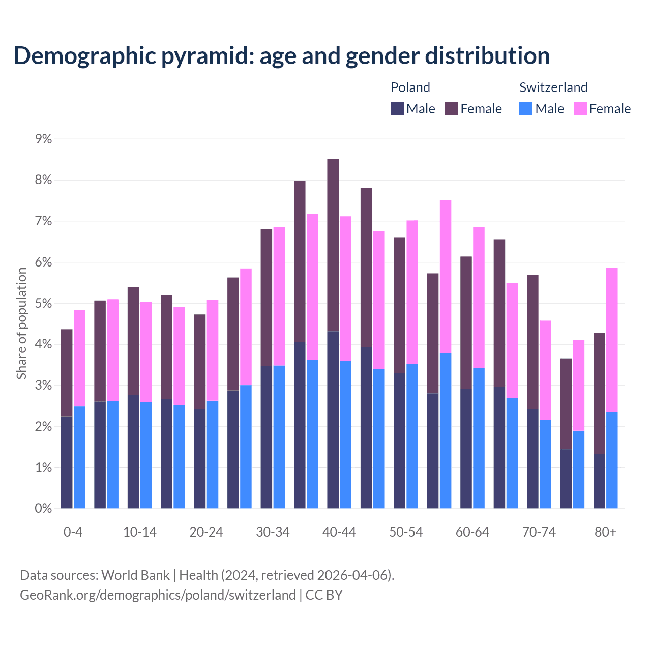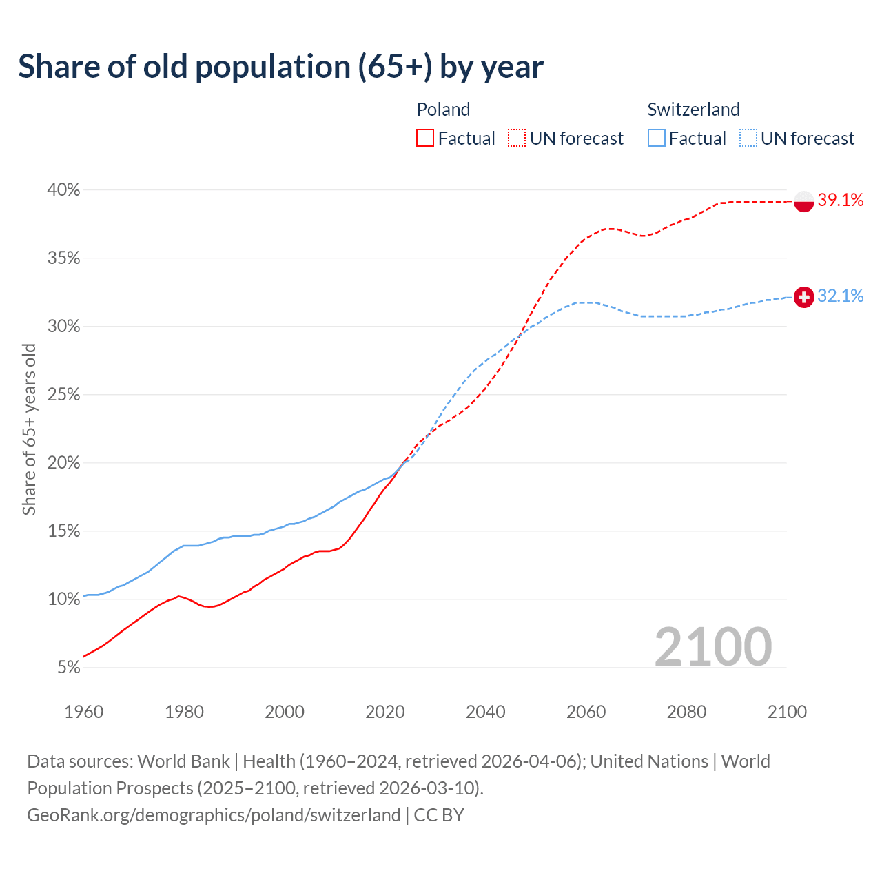 The share of older people aged 65 and over is 20.1% in Poland and 20% in Switzerland. Life expectancy in Poland compared to Switzerland .