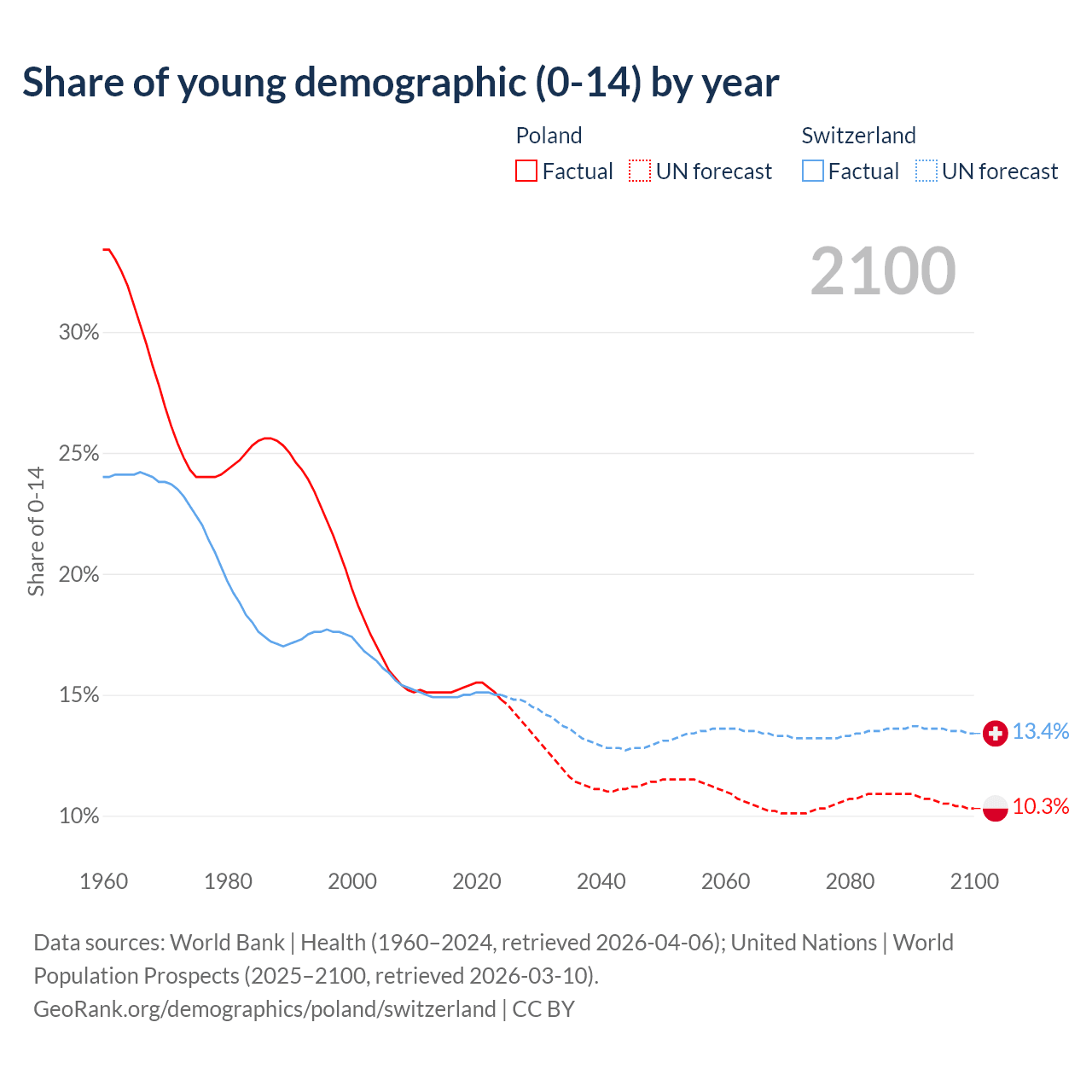 - The share of young demographic (0-15 years old) in Poland is 14.8% vs 15% in Switzerland.