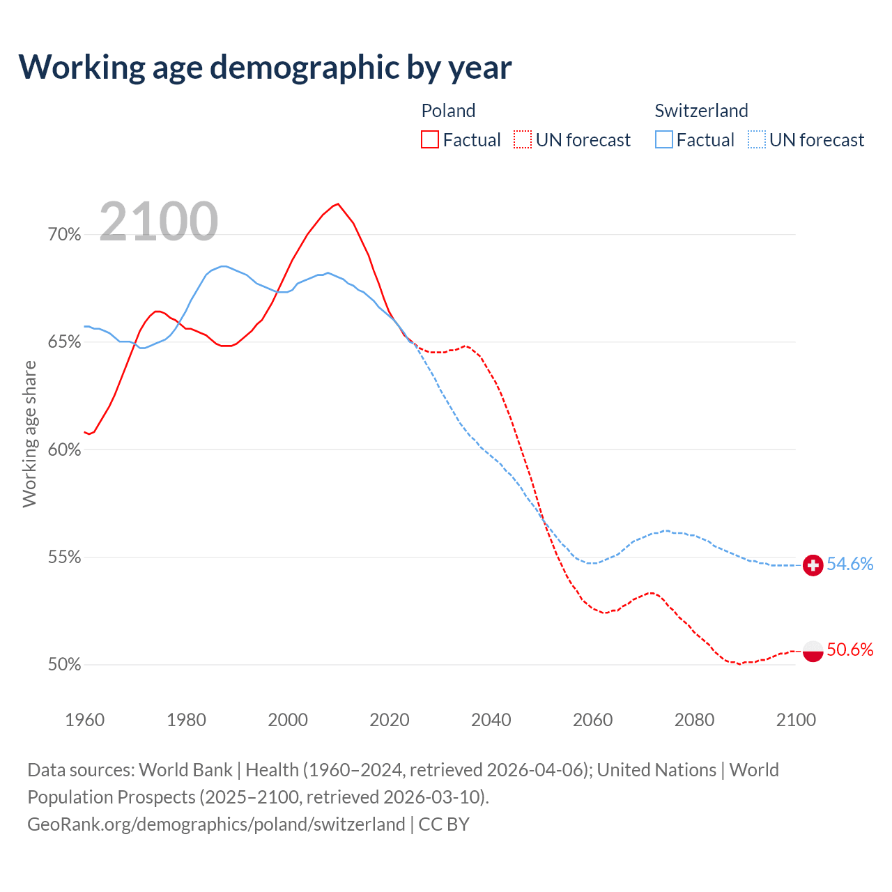 Median age Poland vs Switzerland, 1960-2100