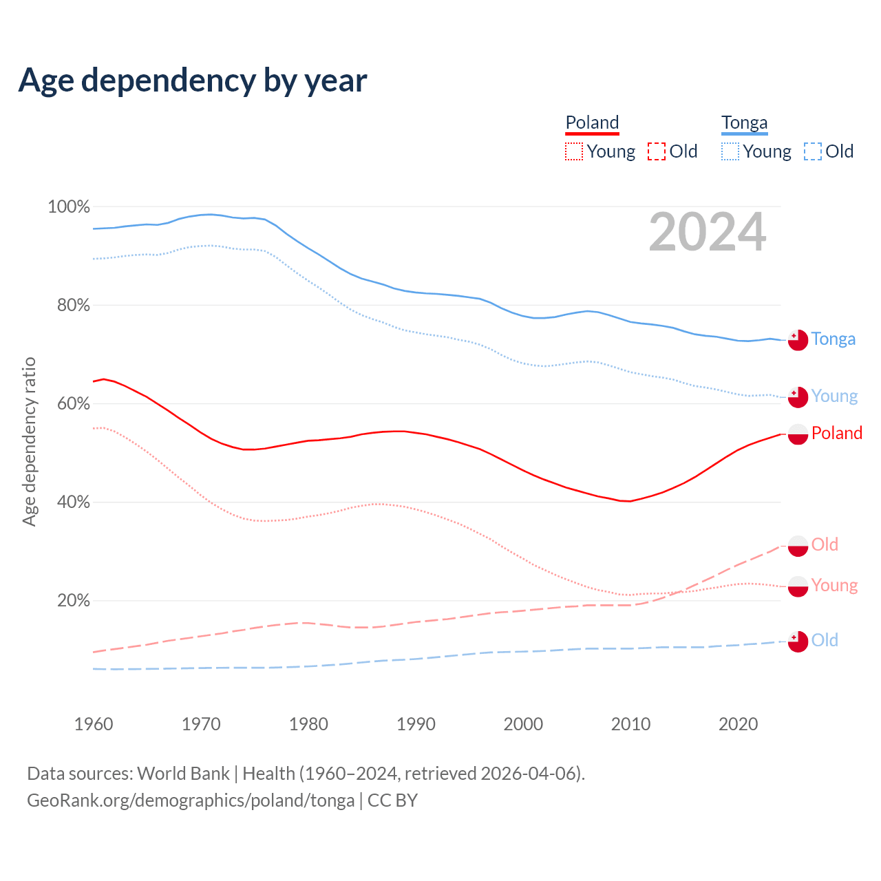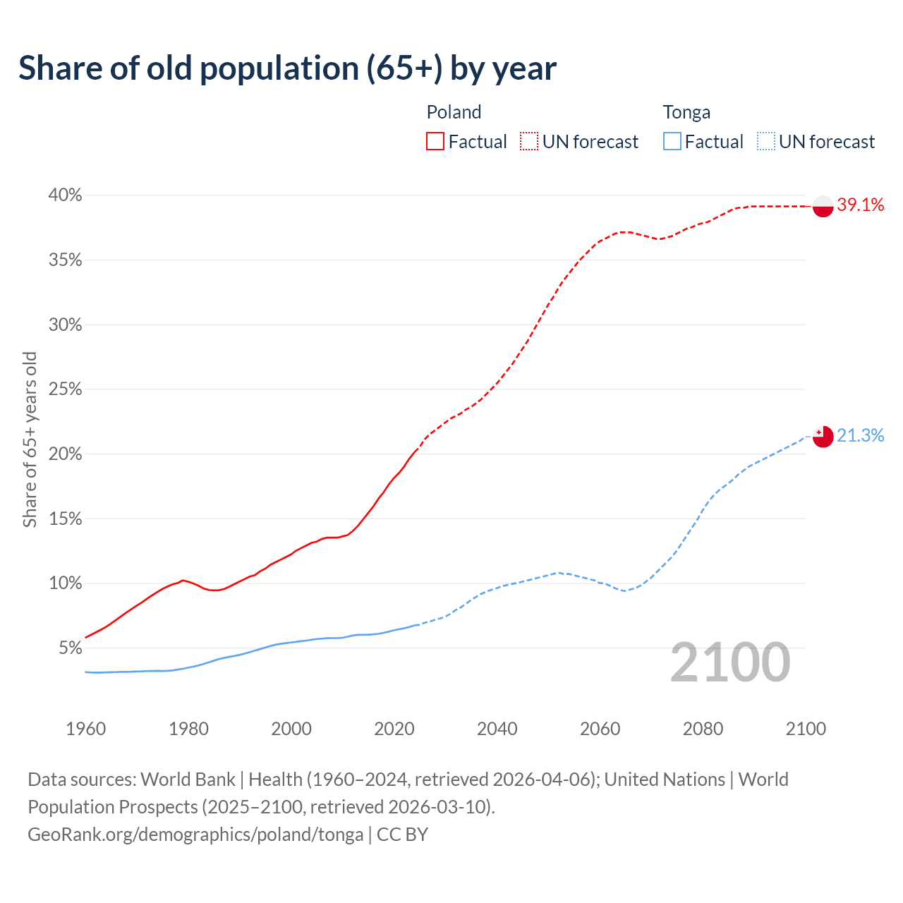 The share of older people aged 65 and over is 20.1% in Poland and 6.72% in Tonga. Life expectancy in Poland compared to Tonga .