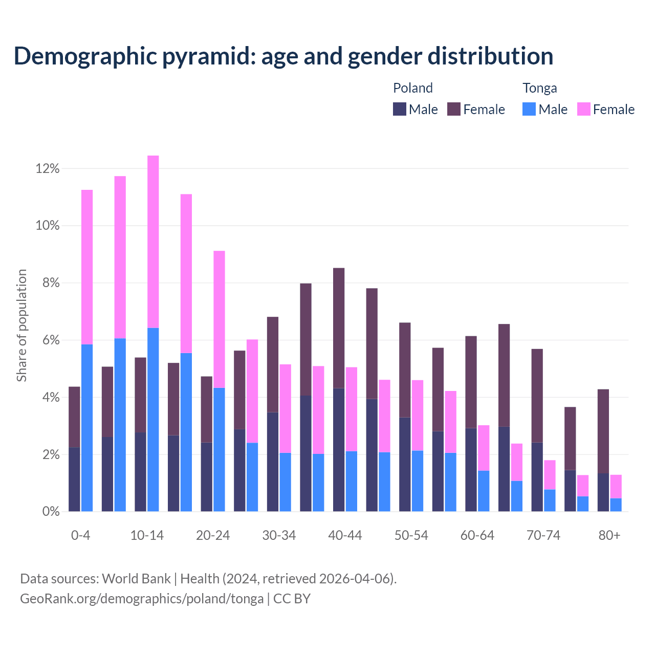 - As of 2026, the population of Poland is 35.8M vs 103K in Tonga - 347 times difference.