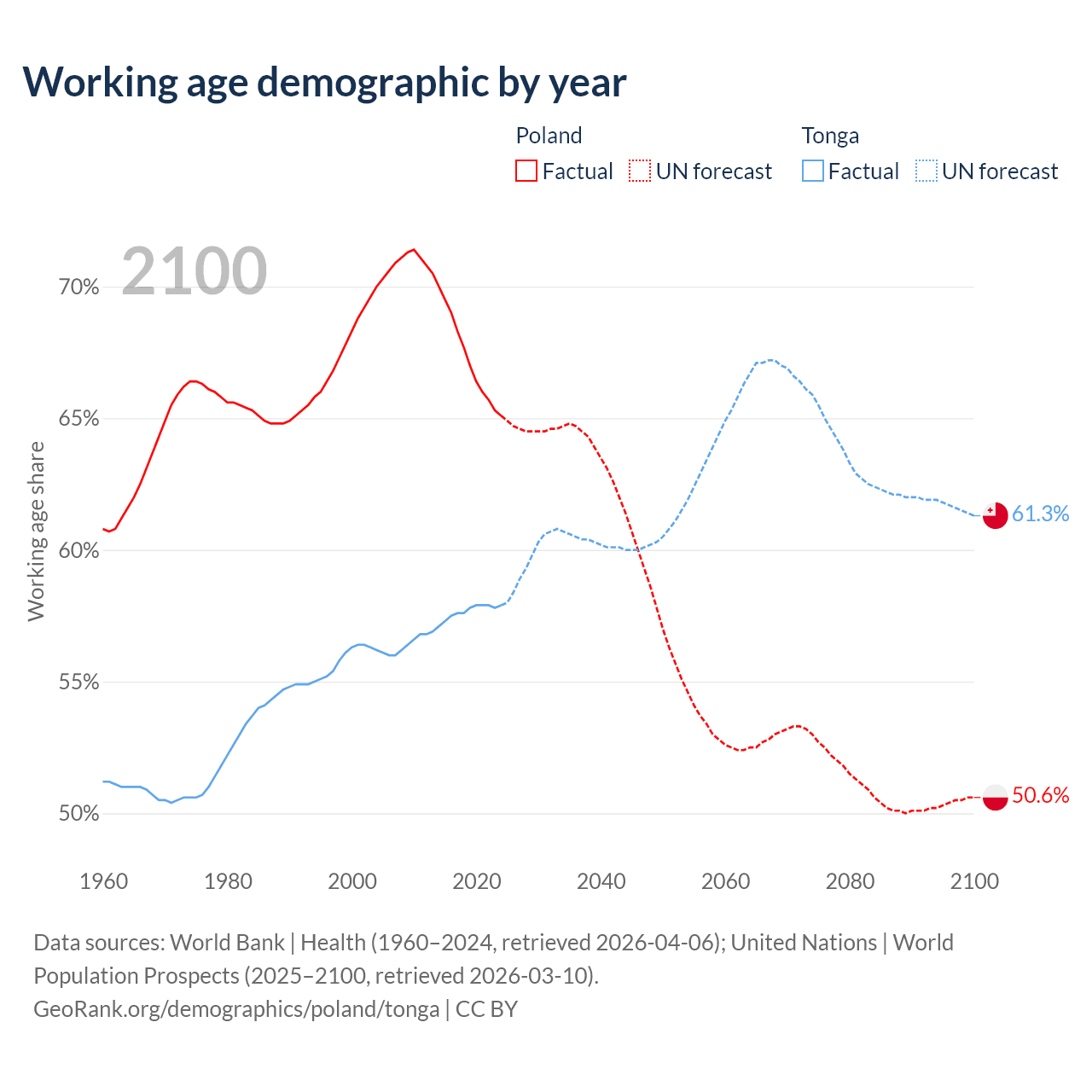 - Poland has 23.3M working age adults (aged 15-64) vs 59.8K in Tonga.