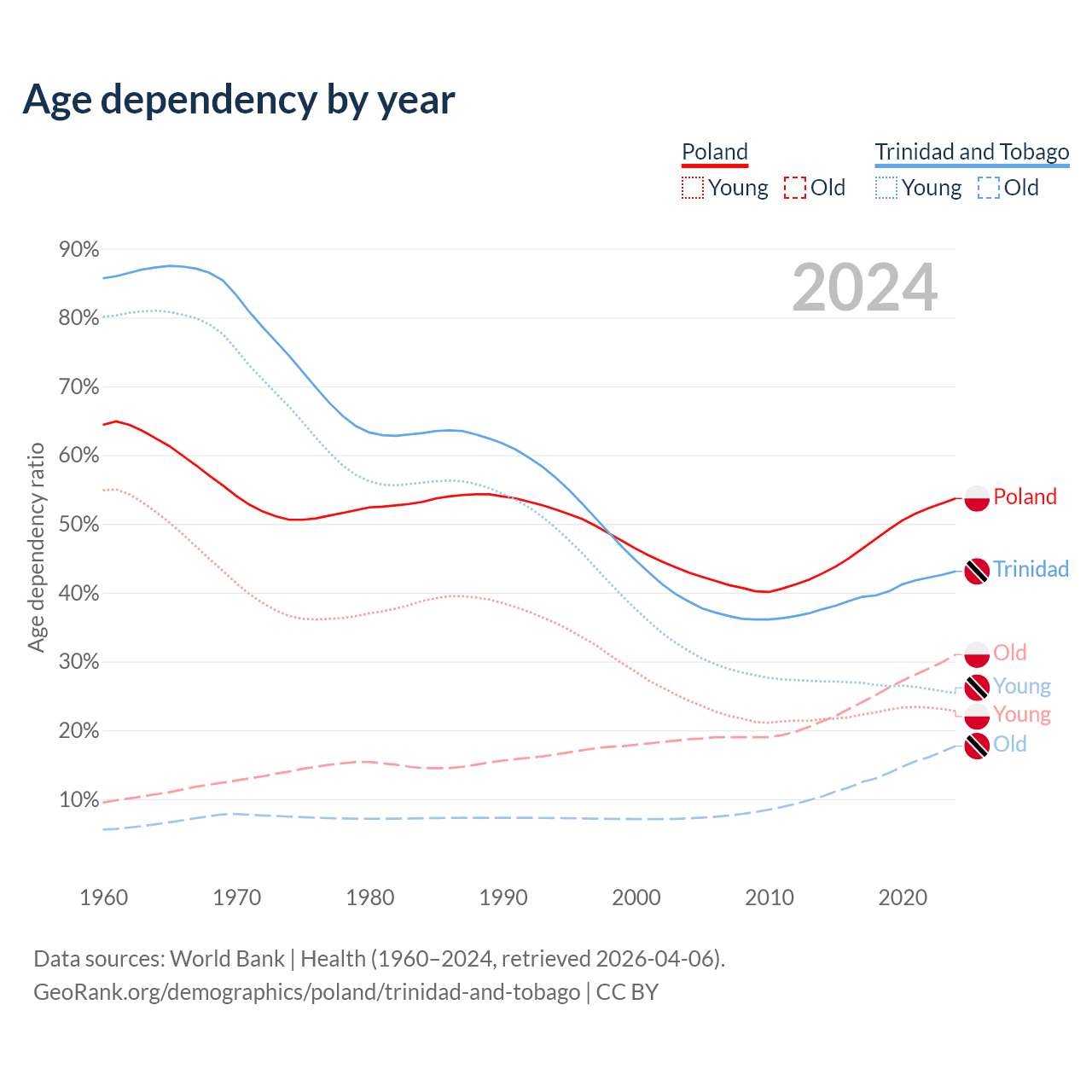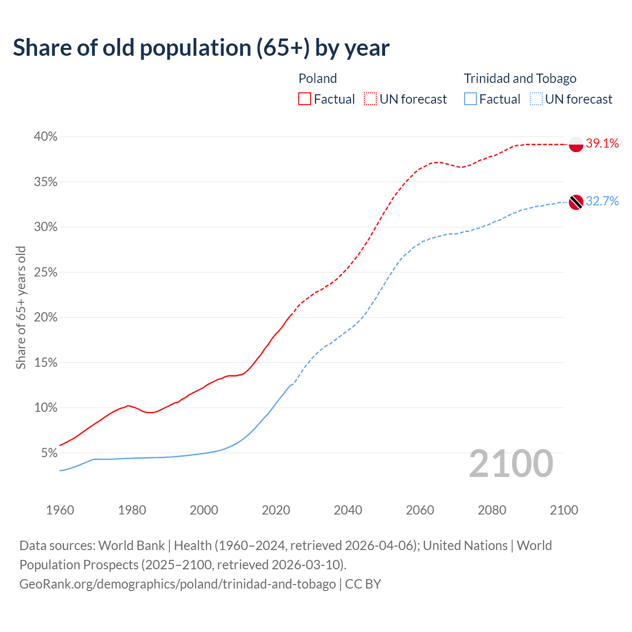 The share of older people aged 65 and over is 20.1% in Poland and 12.4% in Trinidad and Tobago. Life expectancy in Poland compared to Trinidad and Tobago .
