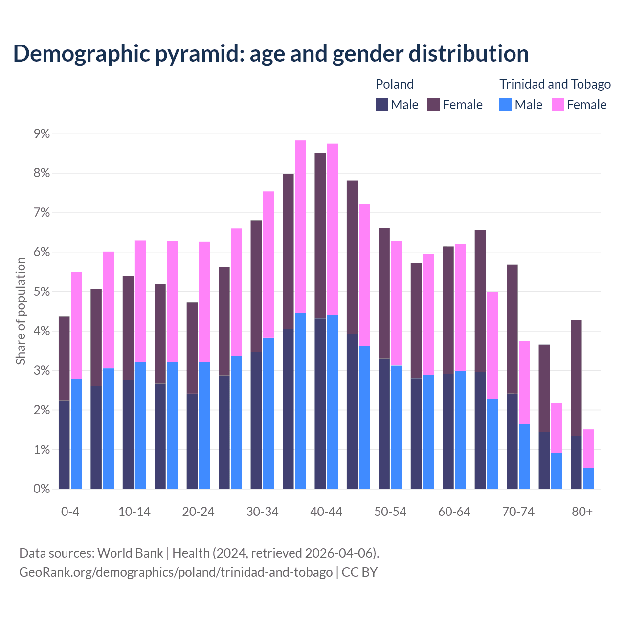 - As of 2026, the population of Poland is 35.8M vs 1.37M in Trinidad and Tobago - 26 times difference.