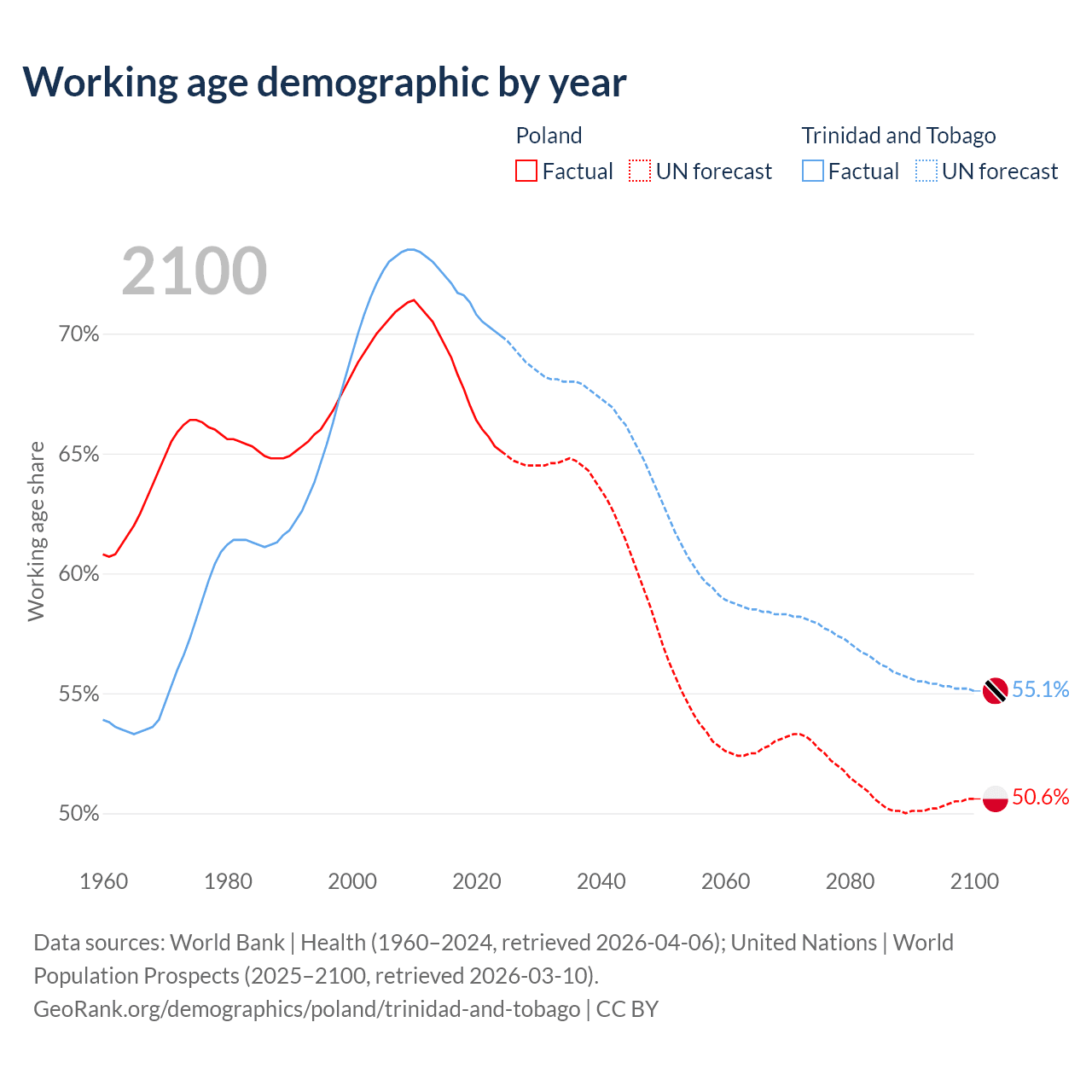 - Poland has 23.3M working age adults (aged 15-64) vs 960K in Trinidad and Tobago.