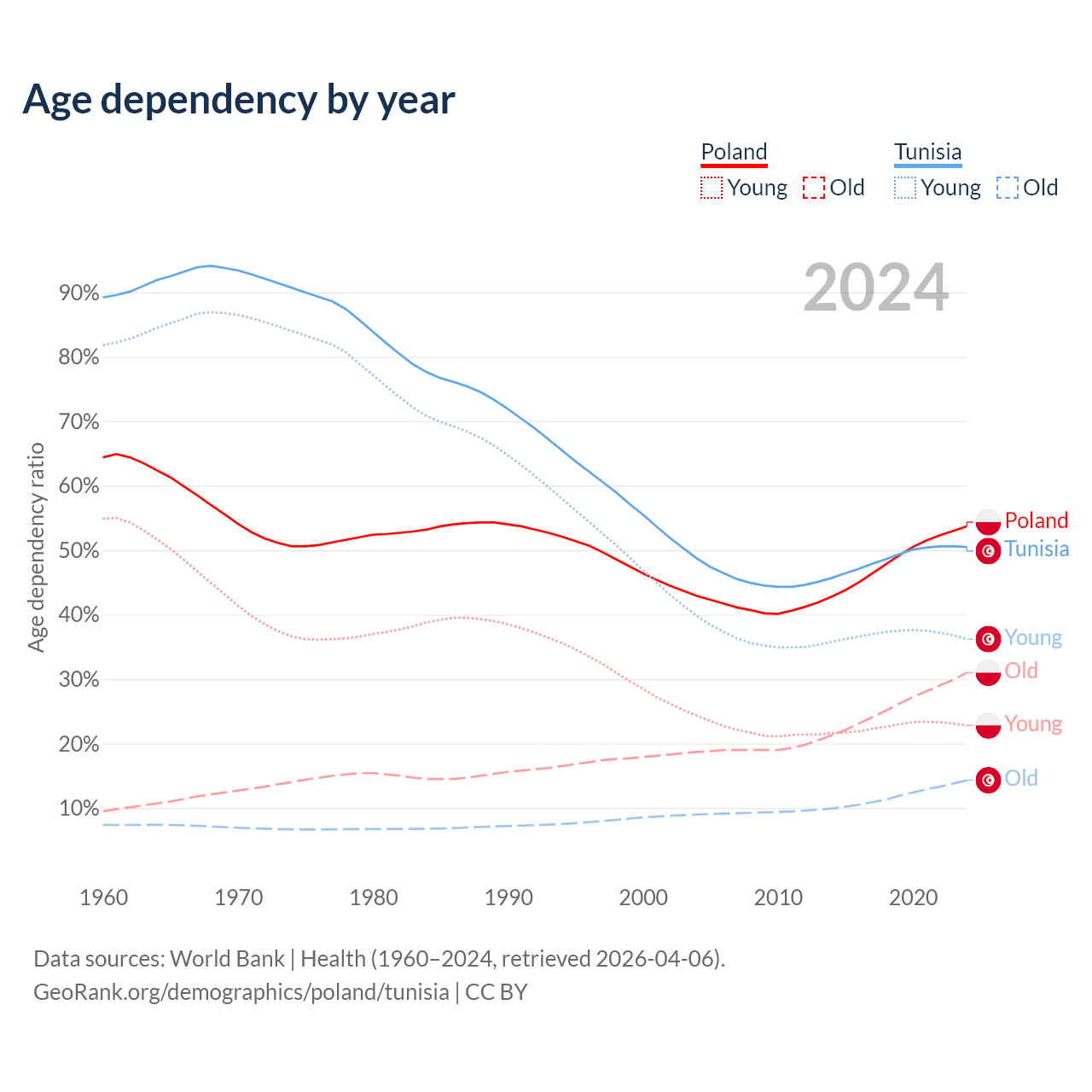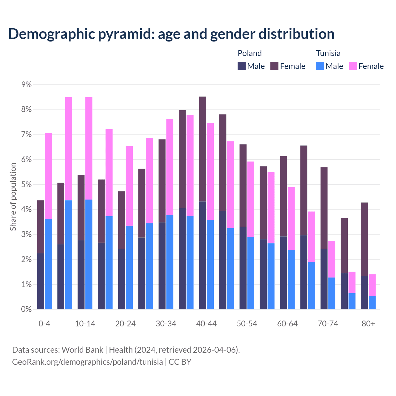 - Poland is ranked 30/196 by median age (oldest to youngest) vs 86/196 for Tunisia.
