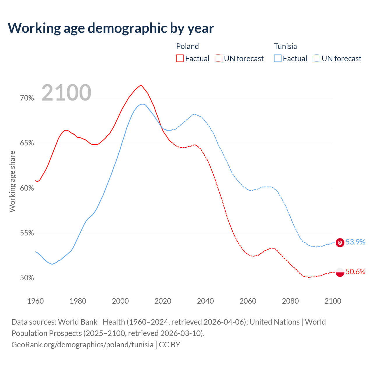 Median age Poland vs Tunisia, 1960-2100