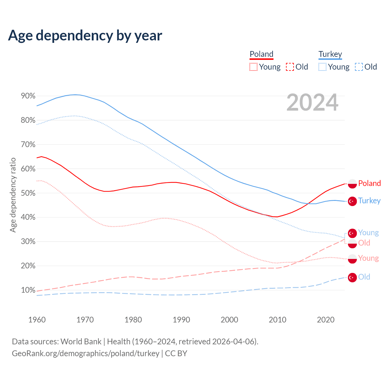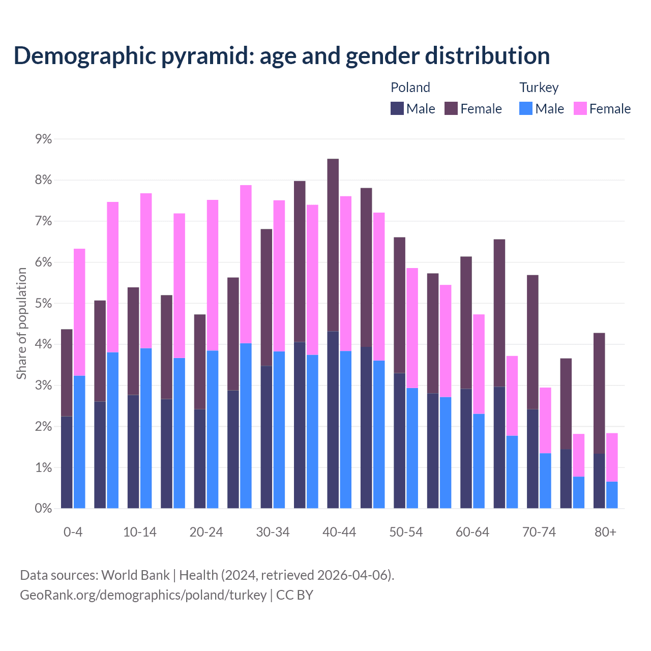 - Poland is ranked 30/196 by median age (oldest to youngest) vs 83/196 for Turkey.