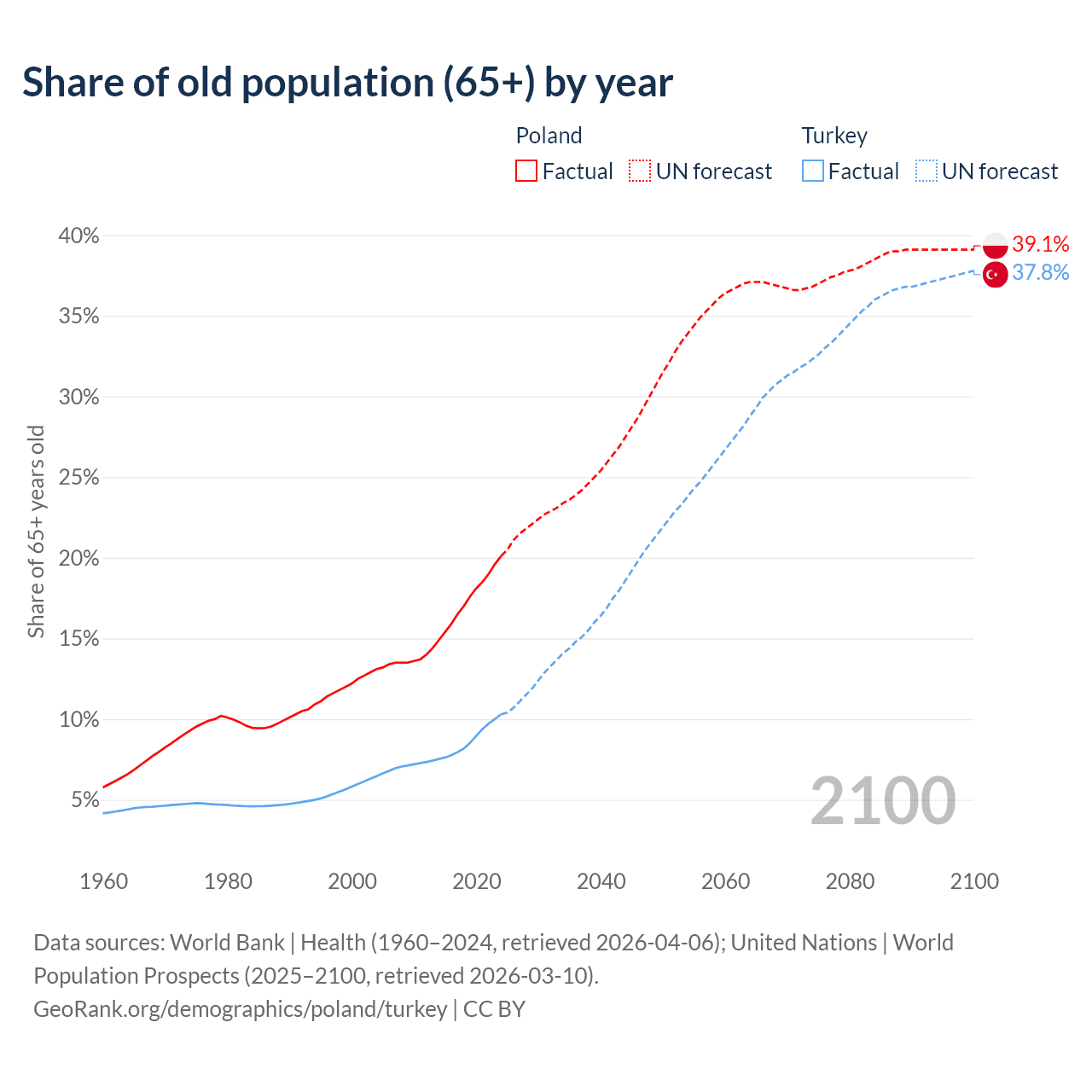 The share of older people aged 65 and over is 20.1% in Poland and 10.3% in Turkey. Life expectancy in Poland compared to Turkey .