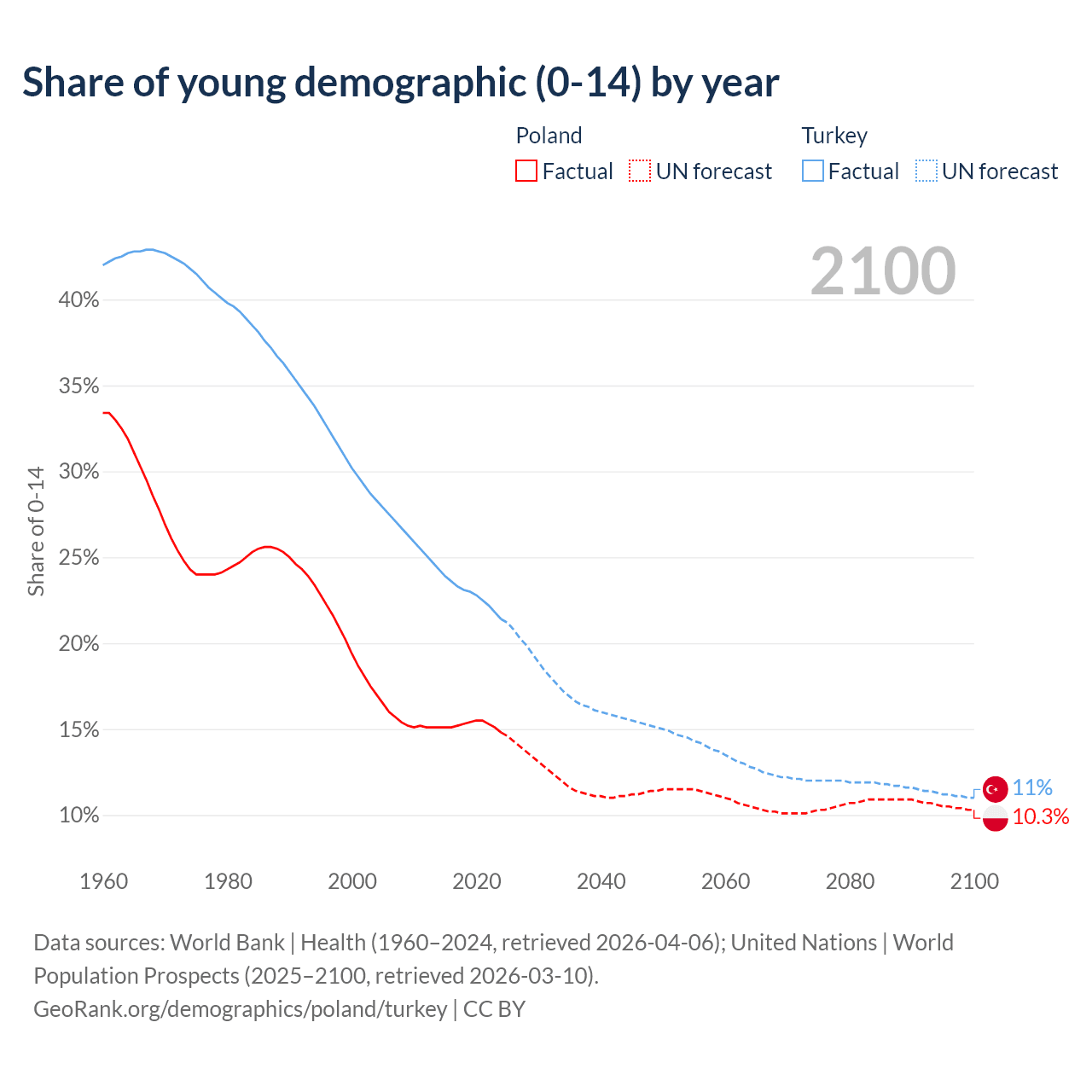 - As of 2026, the population of Poland is 35.8M vs 86M in Turkey - 2.4 times difference.
