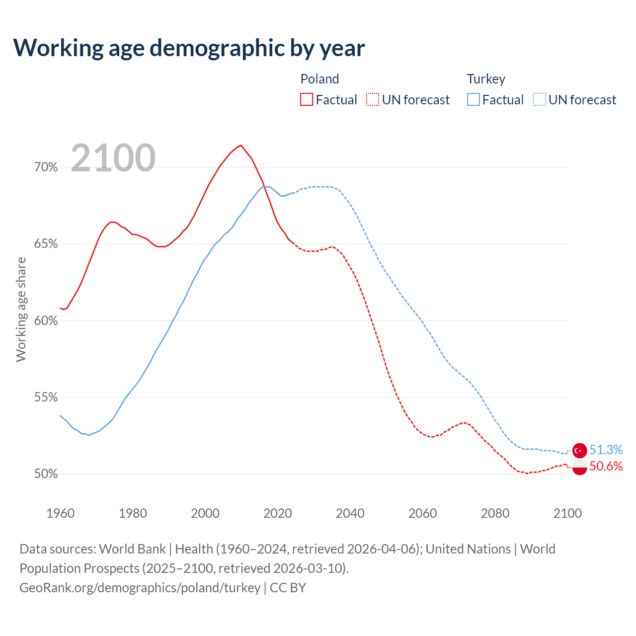 - Poland has 23.3M working age adults (aged 15-64) vs 58.7M in Turkey.