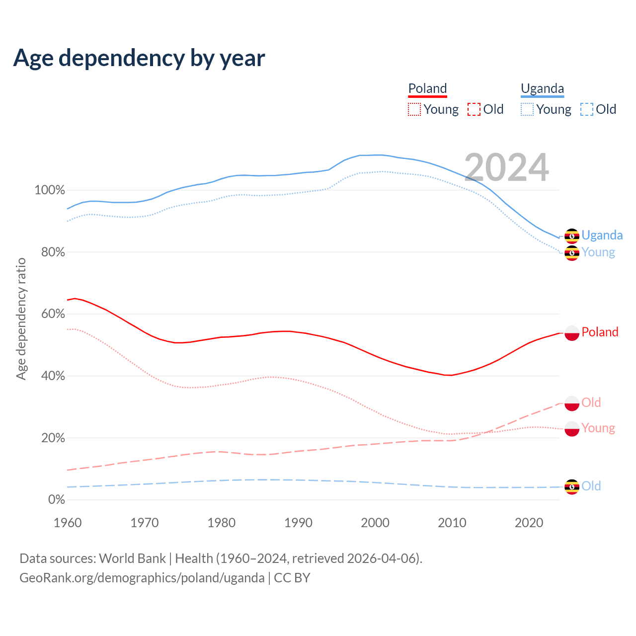 - Poland is ranked 30/196 by median age (oldest to youngest) vs 187/196 for Uganda.