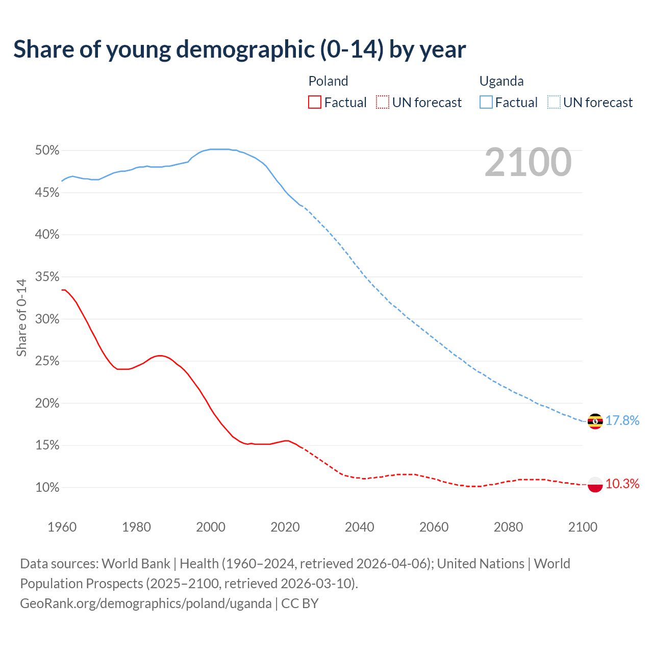 - The share of young demographic (0-15 years old) in Poland is 14.8% vs 43.5% in Uganda.