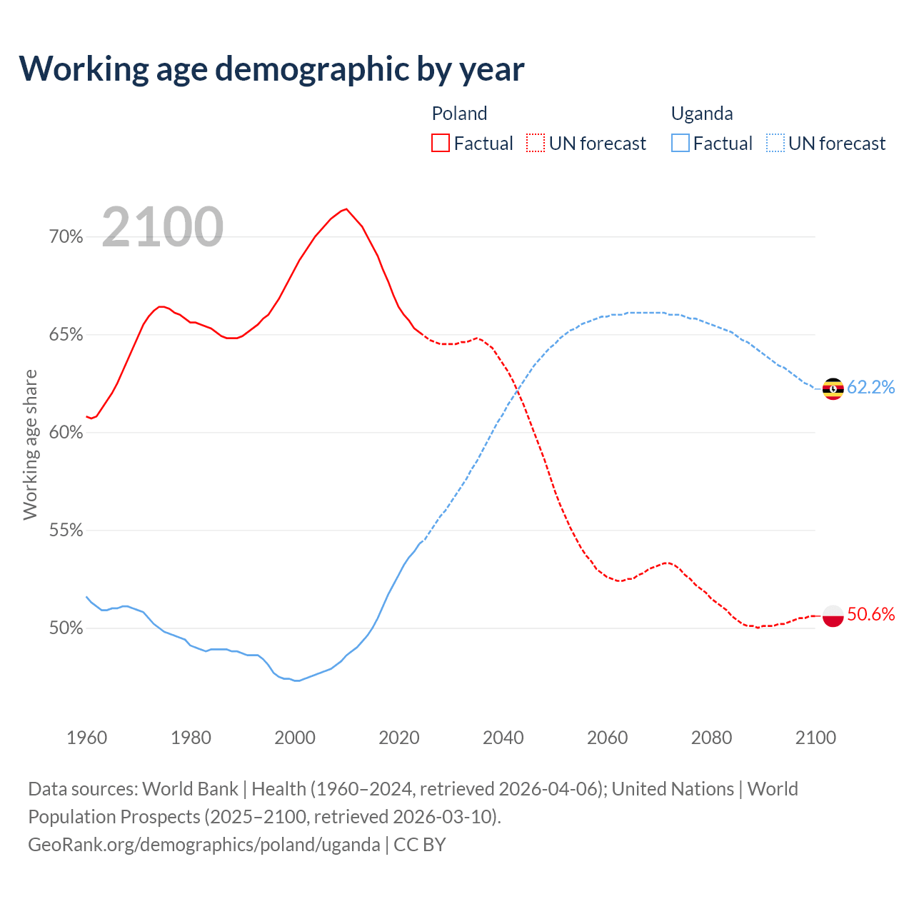 Median age Poland vs Uganda, 1960-2100