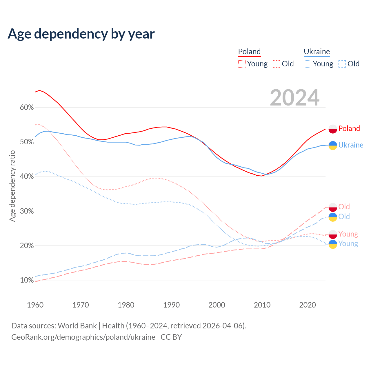 - Poland is ranked 30/196 by median age (oldest to youngest) vs 26/196 for Ukraine.