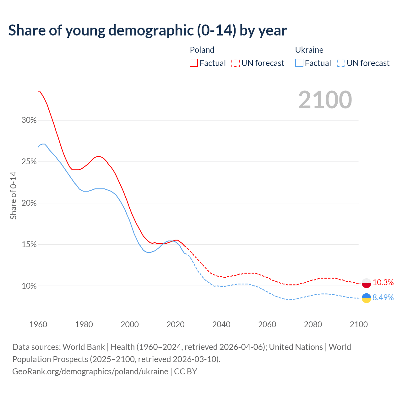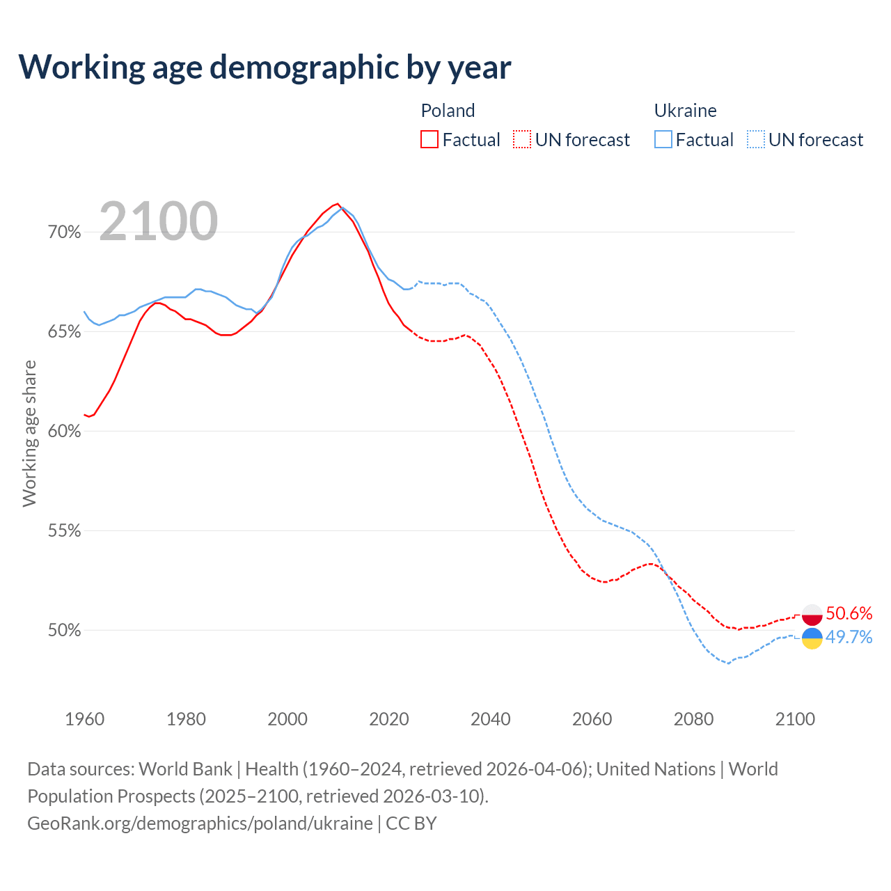 Median age Poland vs Ukraine, 1960-2100
