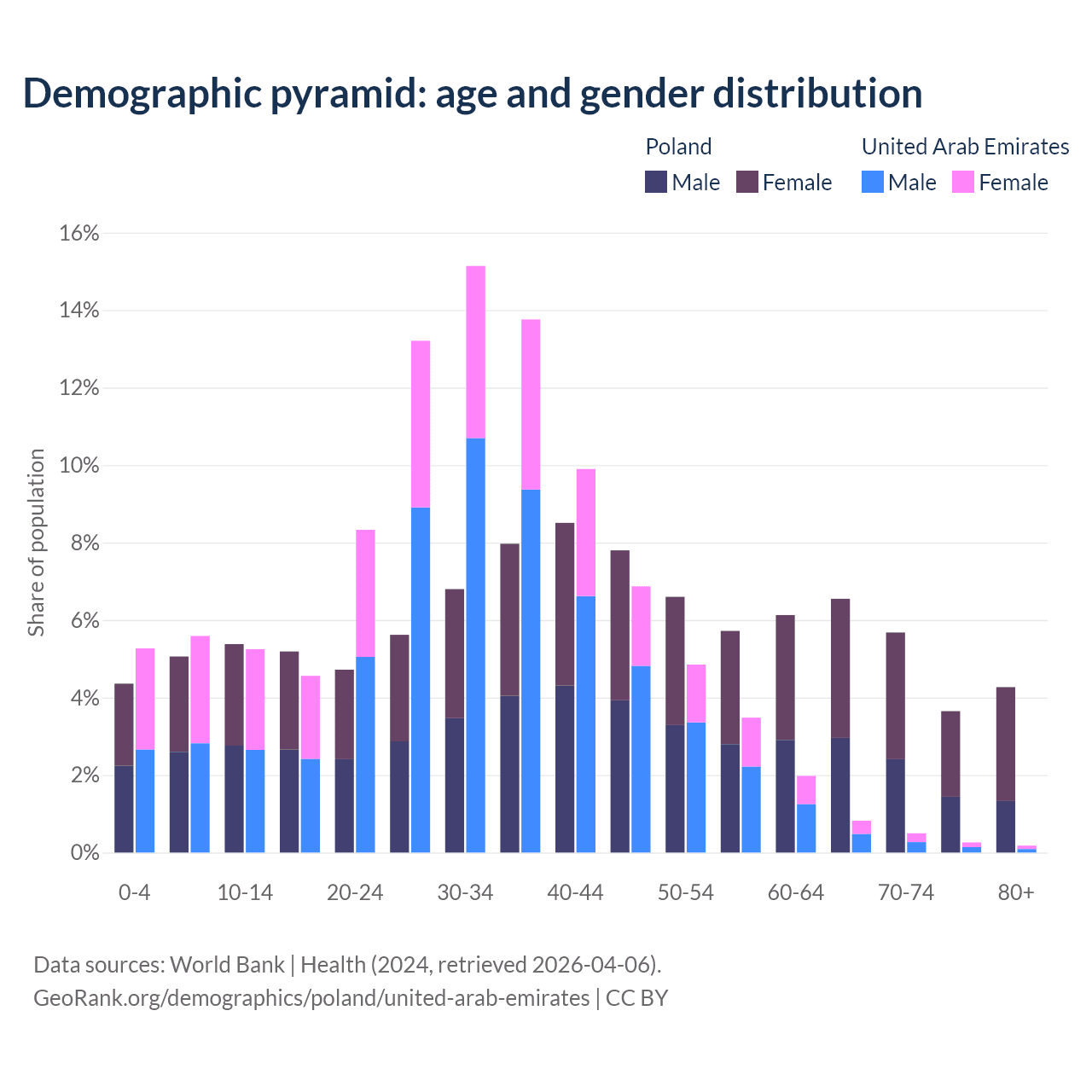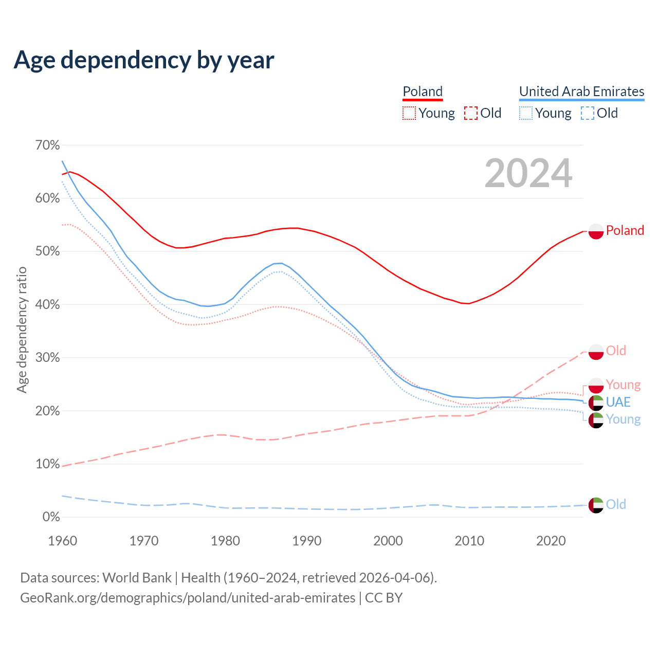 - Poland is ranked 30/196 by median age (oldest to youngest) vs 91/196 for the United Arab Emirates.