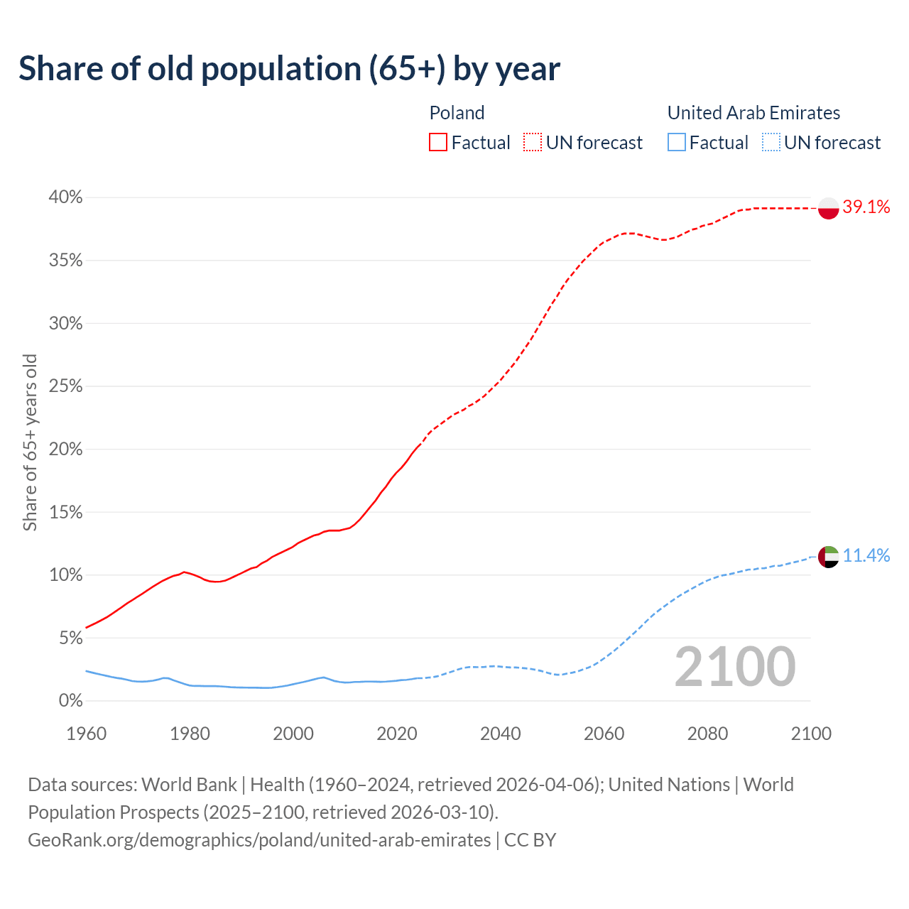 - The share of old-age demographic (65+) in Poland is 20.1% vs 1.77% in the United Arab Emirates.