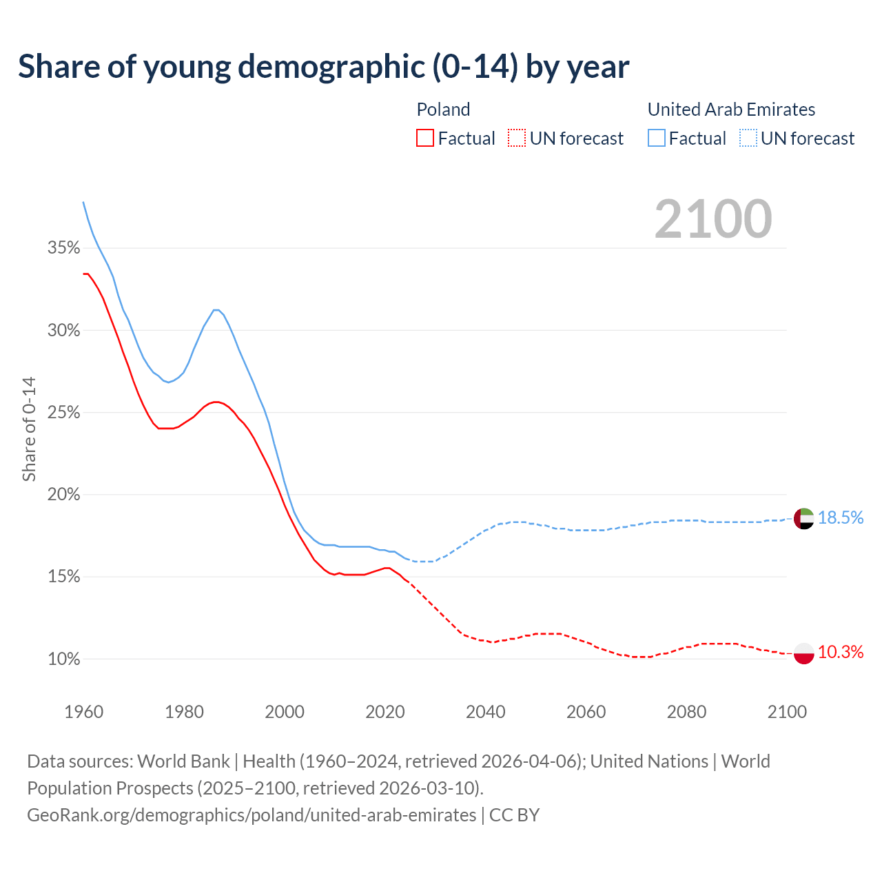 - The share of young demographic (0-15 years old) in Poland is 14.8% vs 16.1% in the United Arab Emirates.