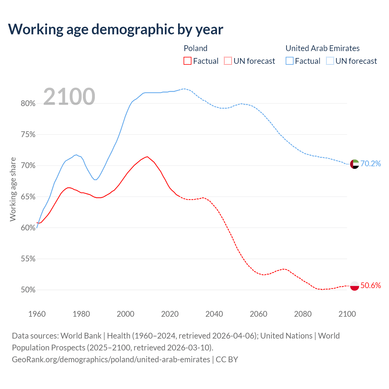 - Poland has 23.3M working age adults (aged 15-64) vs 9.6M in the United Arab Emirates.
