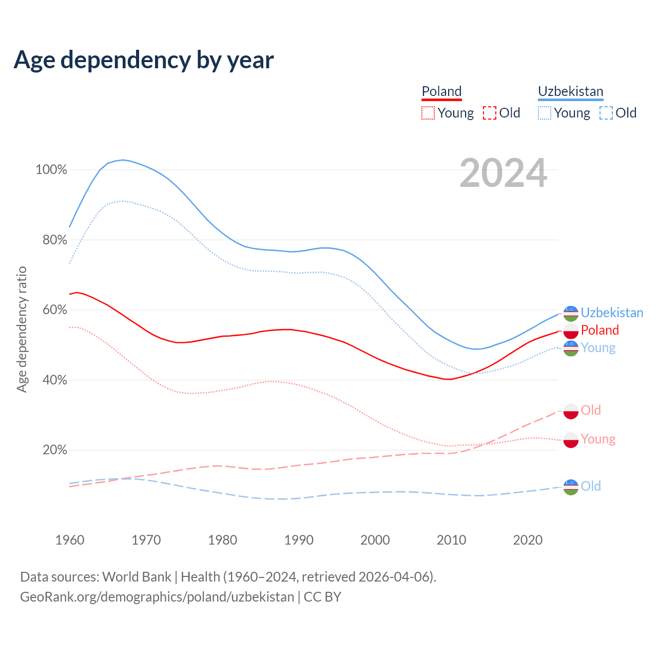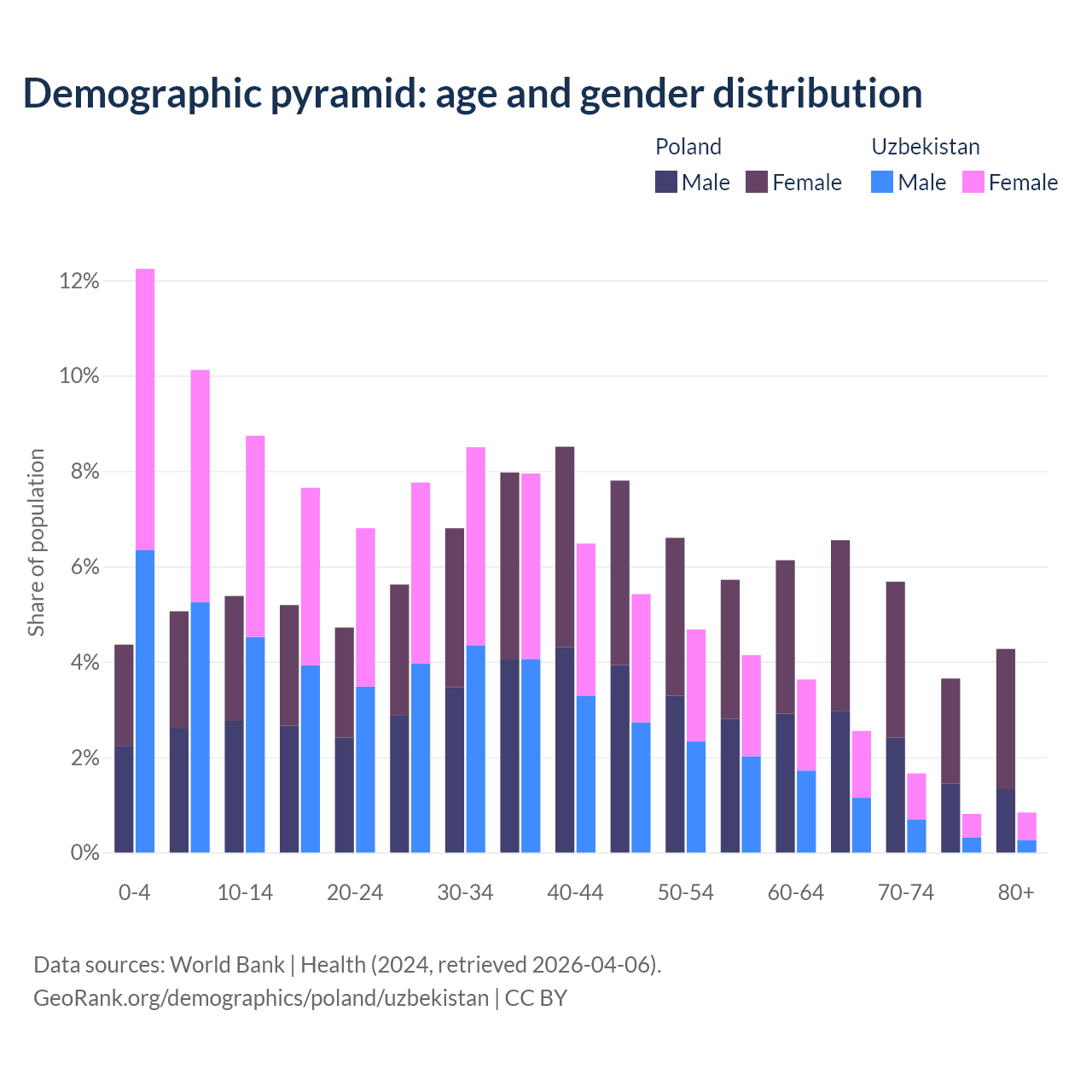 - The share of old-age demographic (65+) in Poland is 20.1% vs 5.86% in Uzbekistan.