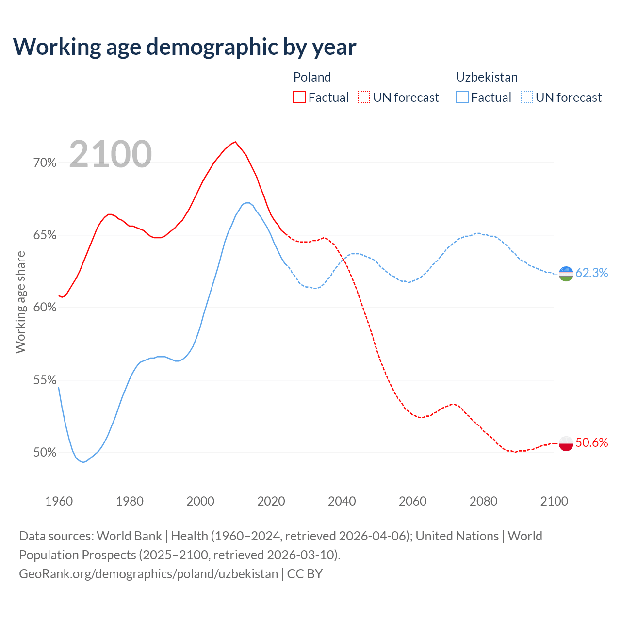 Median age Poland vs Uzbekistan, 1960-2100