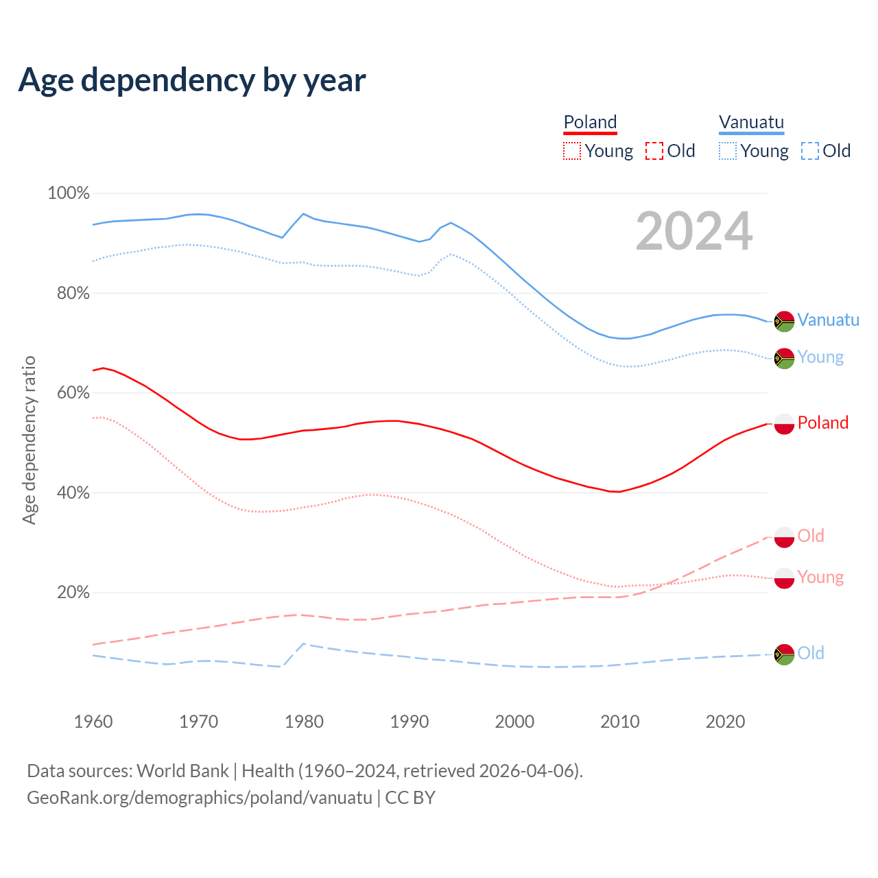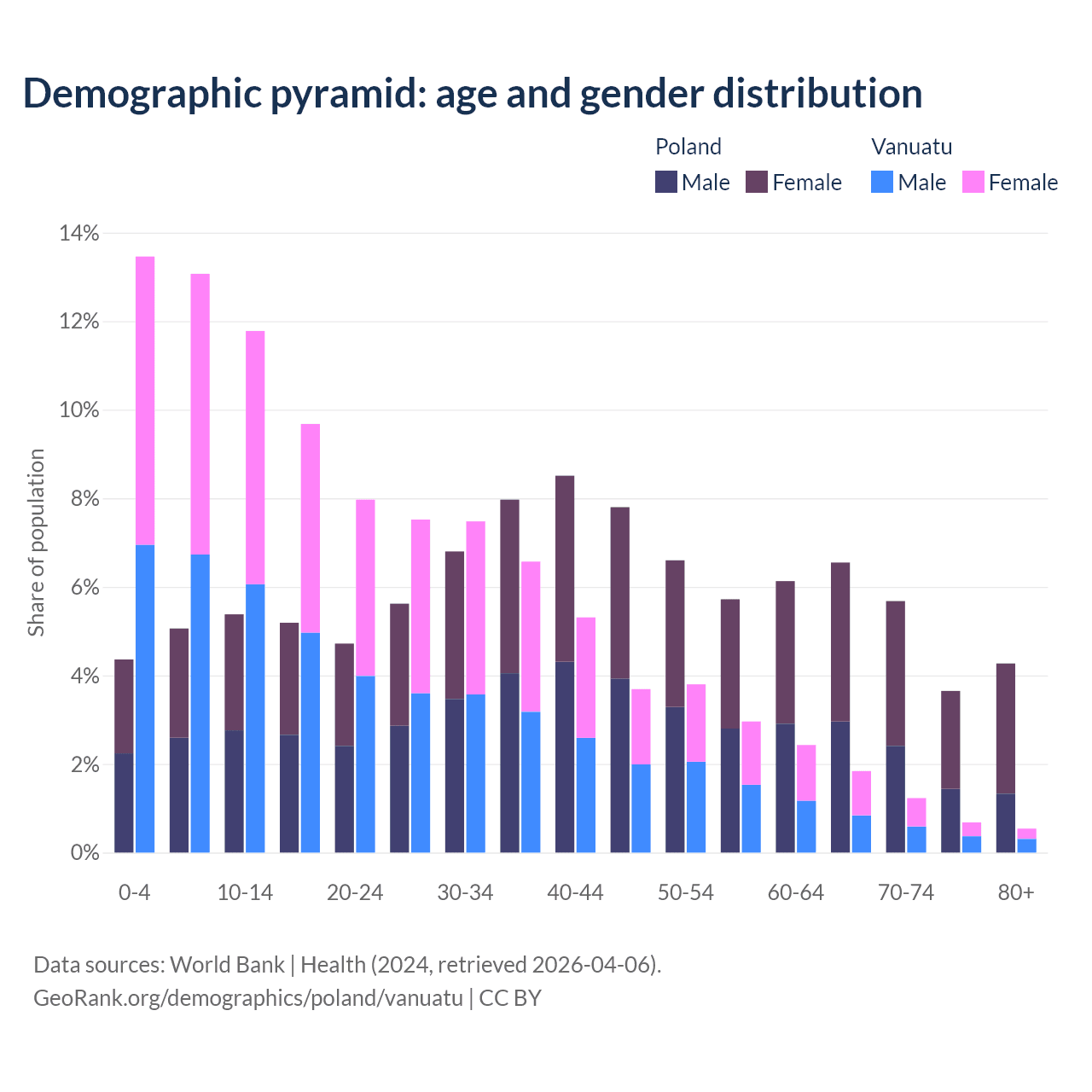 - The share of old-age demographic (65+) in Poland is 20.1% vs 4.3% in Vanuatu.
