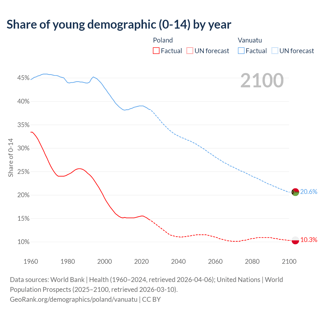 - The share of young demographic (0-15 years old) in Poland is 14.8% vs 38.3% in Vanuatu.
