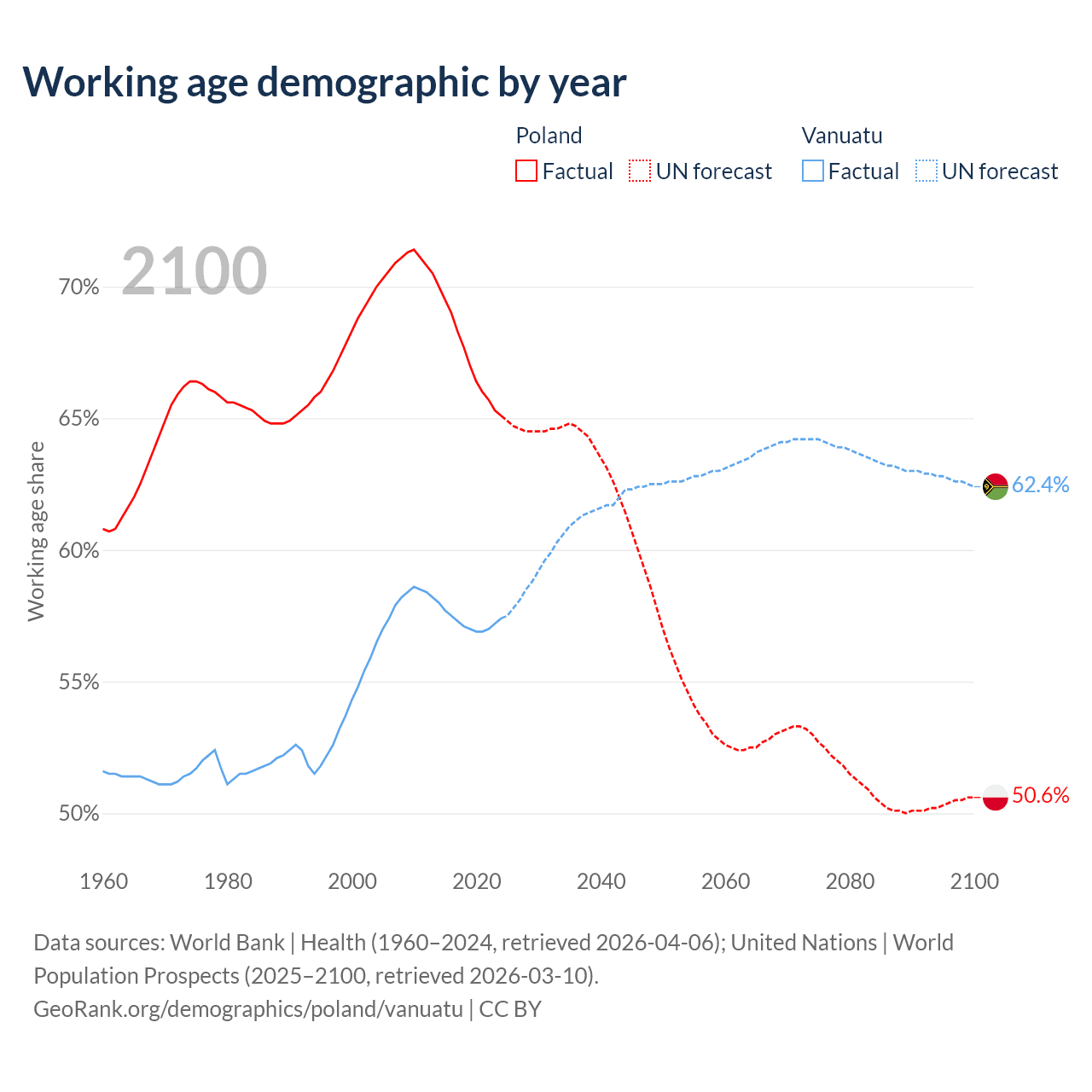 Median age Poland vs Vanuatu, 1960-2100