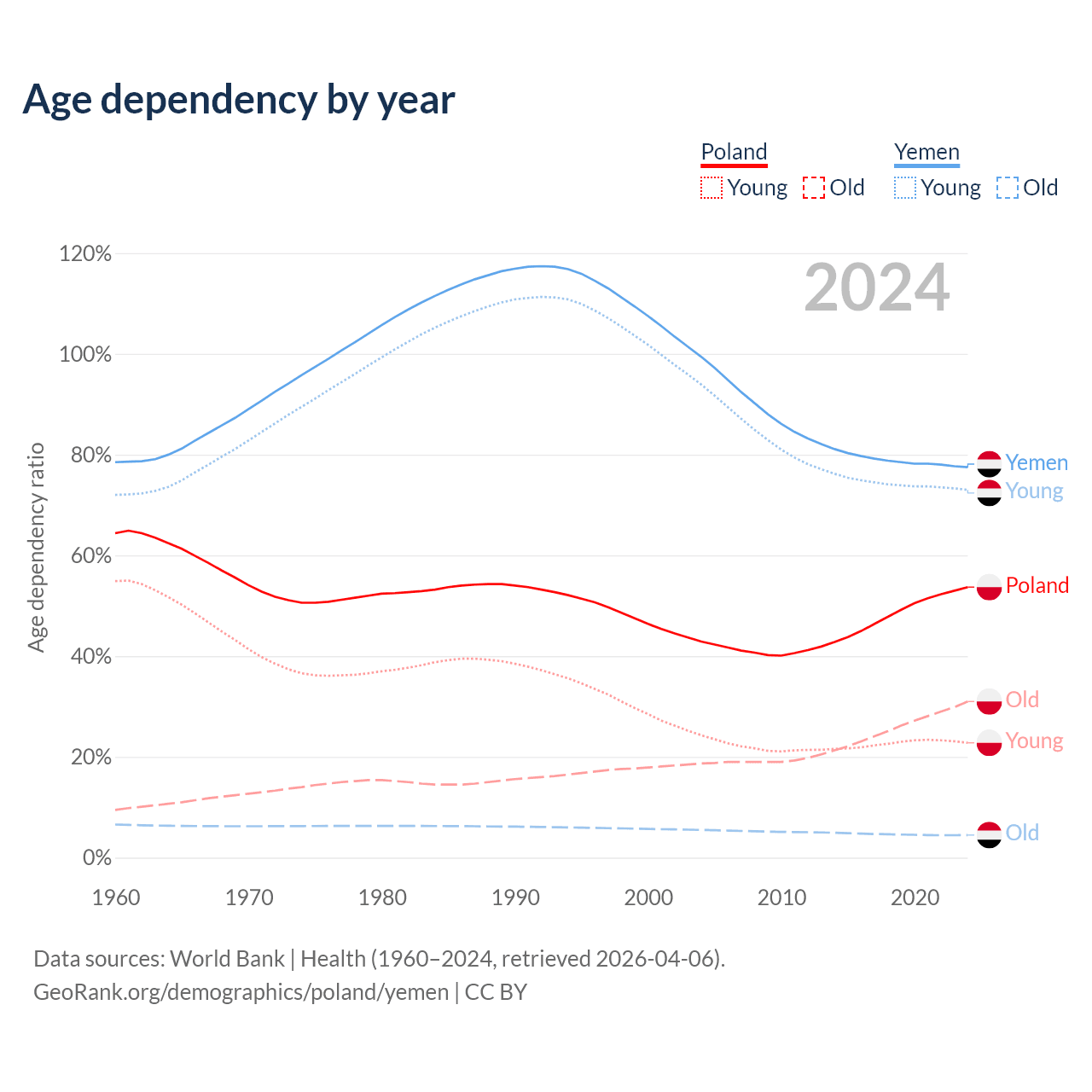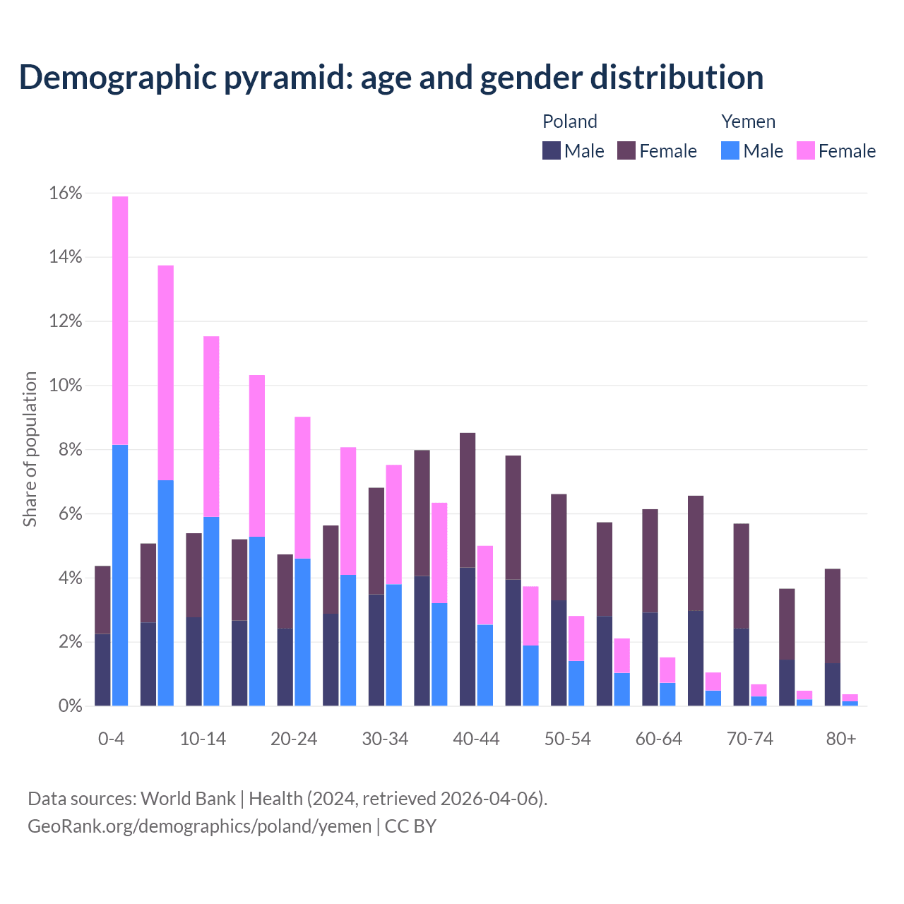 The share of older people aged 65 and over is 20.1% in Poland and 2.52% in Yemen. Life expectancy in Poland compared to Yemen .