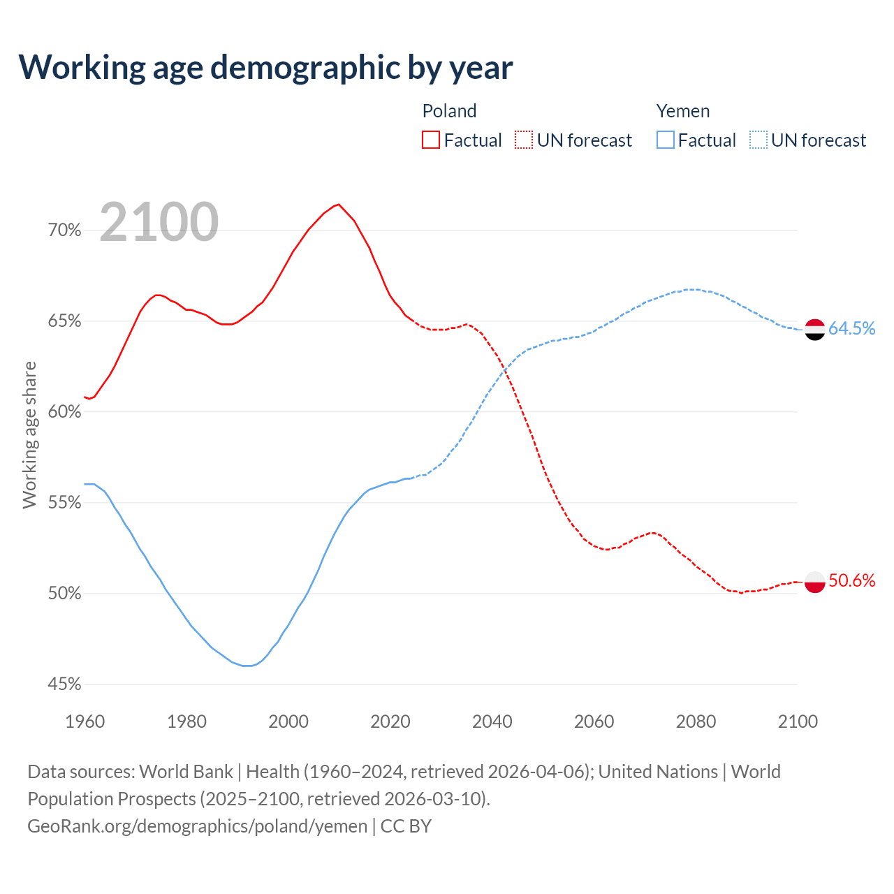 - Poland has 23.3M working age adults (aged 15-64) vs 24.4M in Yemen.