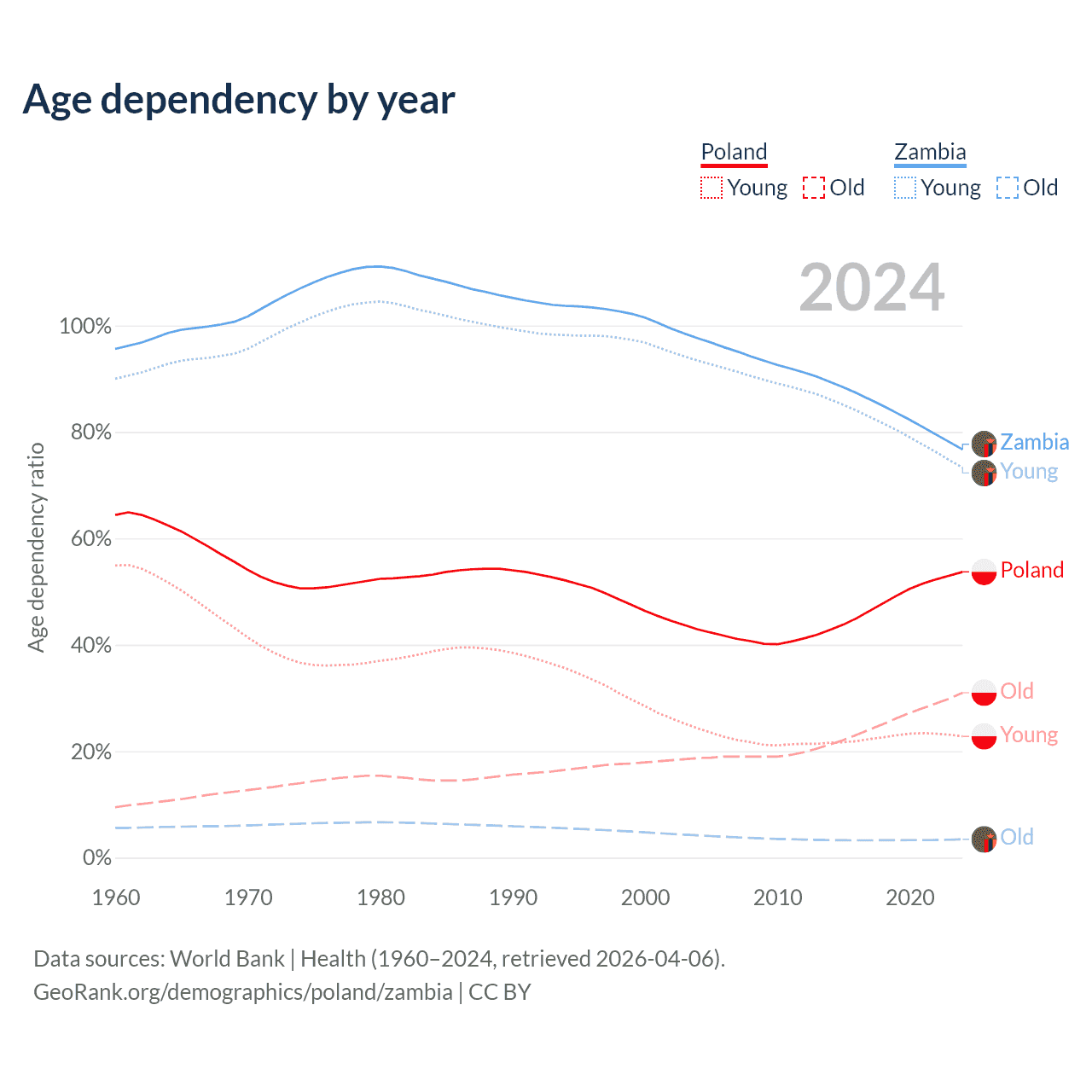 - Poland is ranked 30/196 by median age (oldest to youngest) vs 182/196 for Zambia.